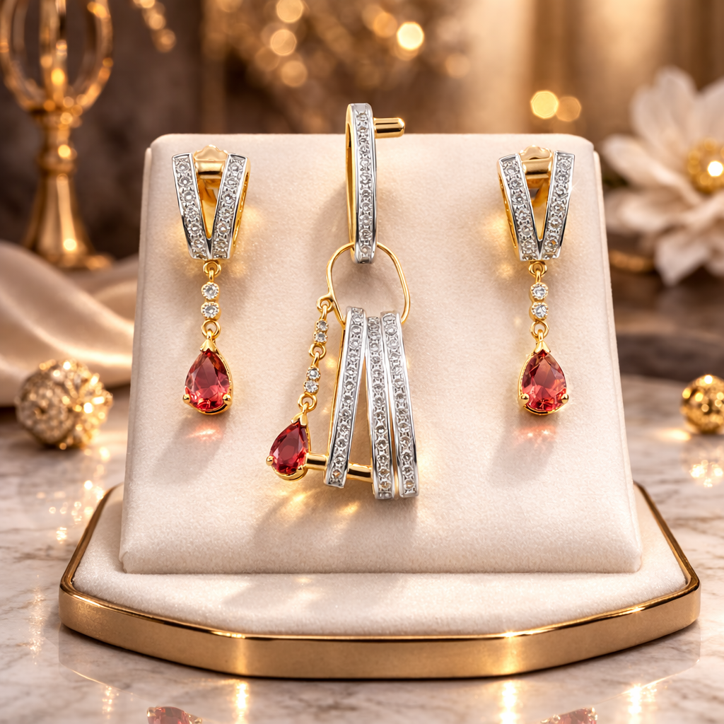 Celebrate modern elegance with this exquisite 18K yellow gold natural Diamond & Pink Tourmaline pendant and earrings set, designed with a refined geometric silhouette.