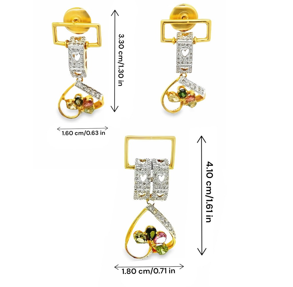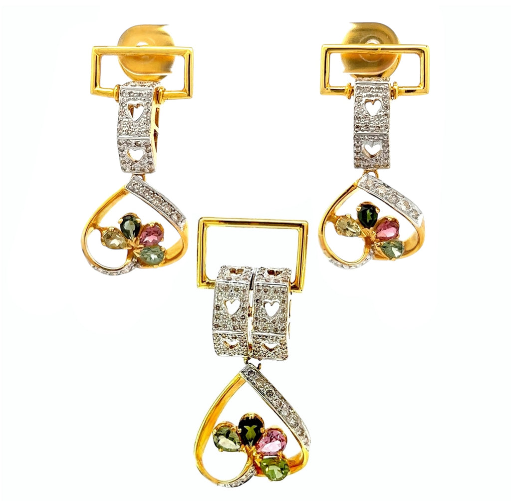 18K Two Tone Gold Natural Diamond & Multi Tourmaline Pendant Earring Set Jewelry