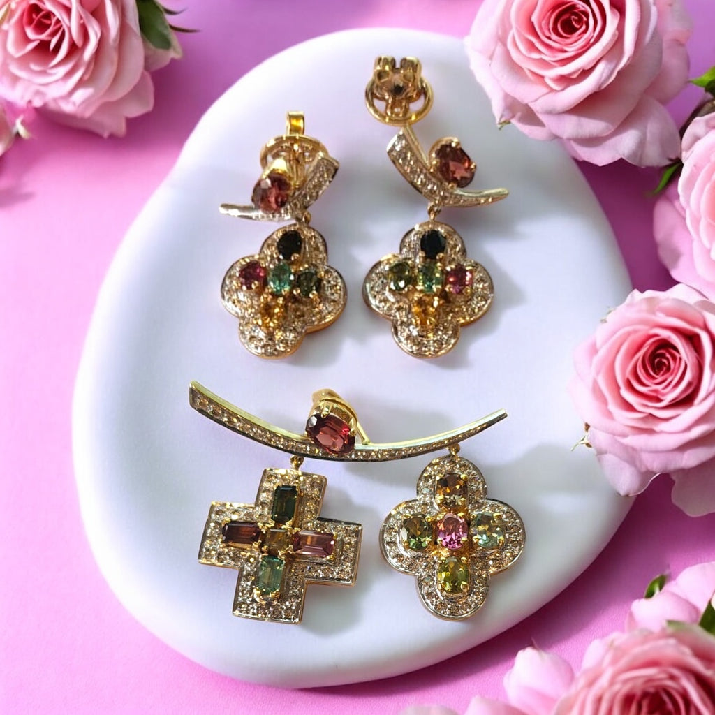 Celebrate meaningful elegance with this 18K Two Tone Gold Pendant and Earring Set, featuring a beautifully crafted cross design adorned with natural diamonds and vibrant multi-color tourmaline gemstones. The harmonious blend of yellow and white gold enhances the colorful sparkle and symbolic form of the set.