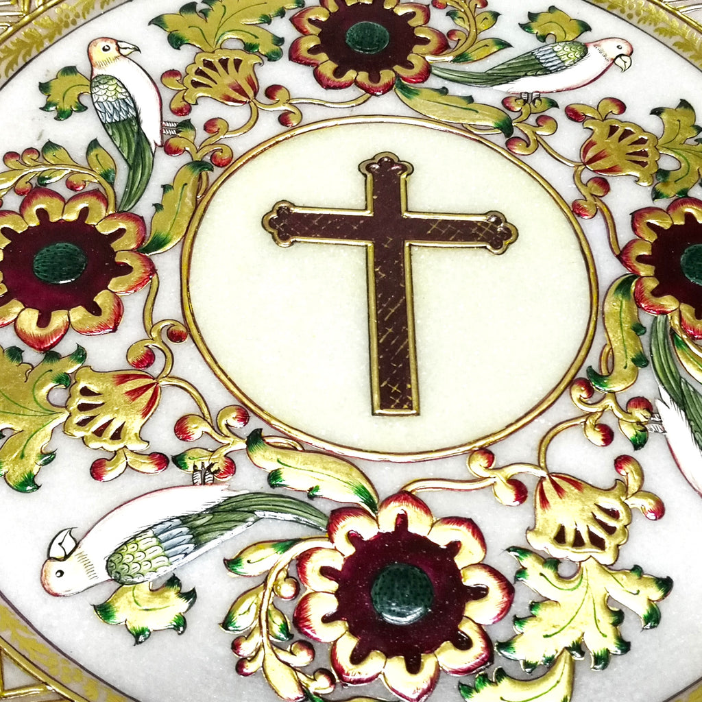 24K Gold Marble Handcrafted Catholic Jesus Cross 12" Renaissance Floral Plate
