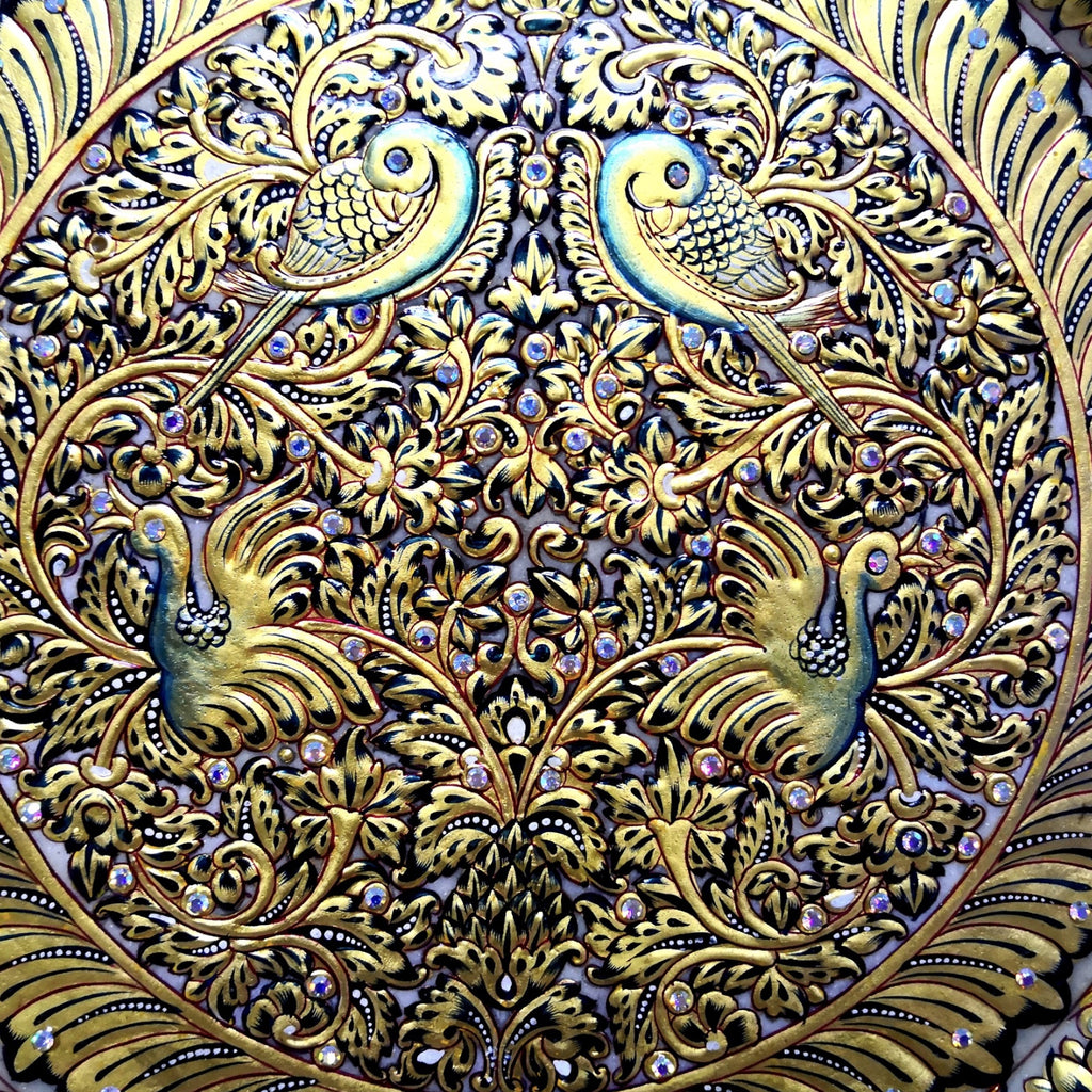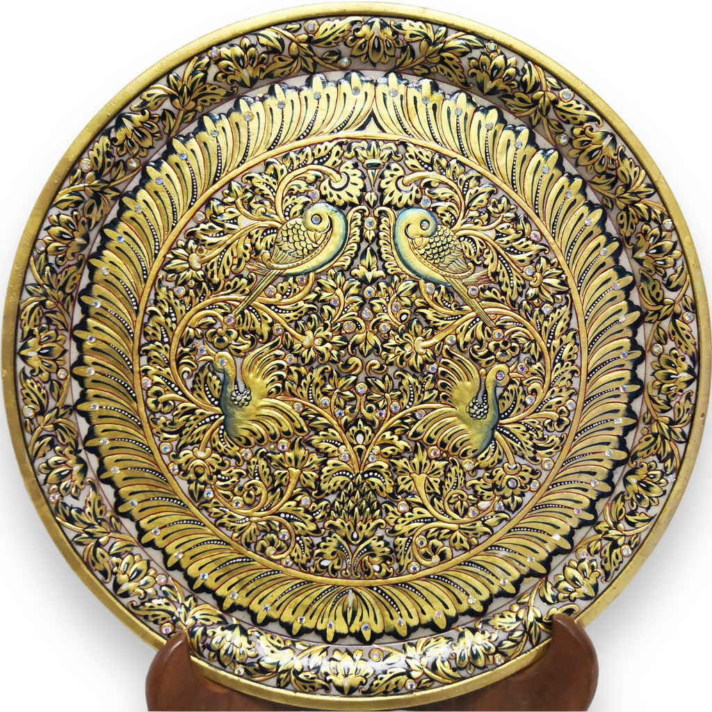 24K Gold Handcrafted Unique Marble Peacock 12" Round Platter
