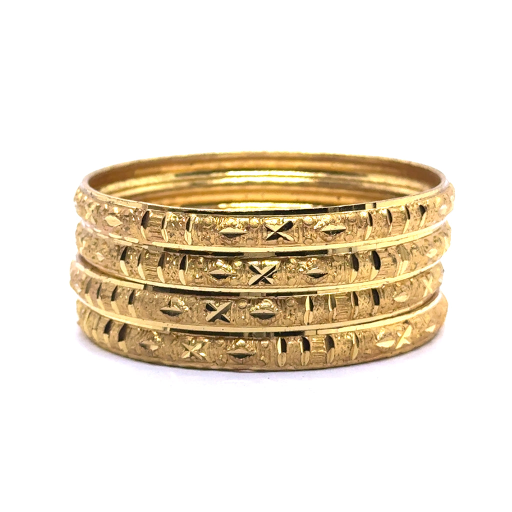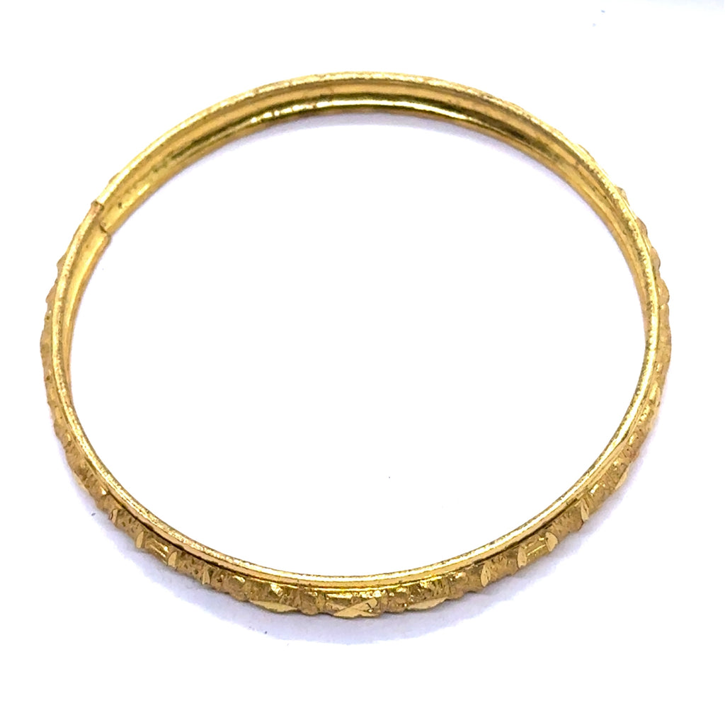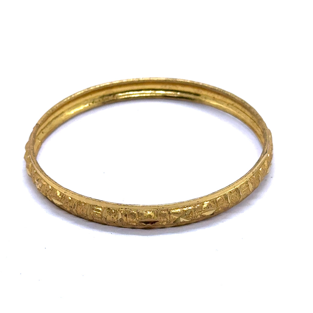 Celebrate exquisite texture with this classic, hand-engraved bangle. This beautiful piece is enveloped in a classic geometric motif, with masterful, hand-engraved detailing covering its entire surface. This intricate work gives the luminous yellow gold plating a rich, tactile quality and a subtle, sophisticated shimmer. Perfect as a refined standalone accessory or for adding texture to a favorite bangle stack, its timeless design bridges traditional artistry and modern style, making it a versatile addition to any jewelry collection.
