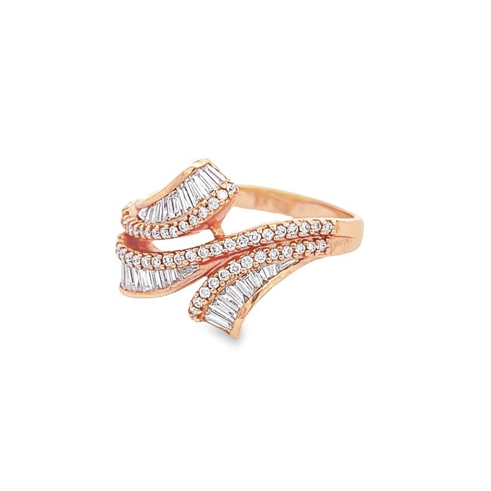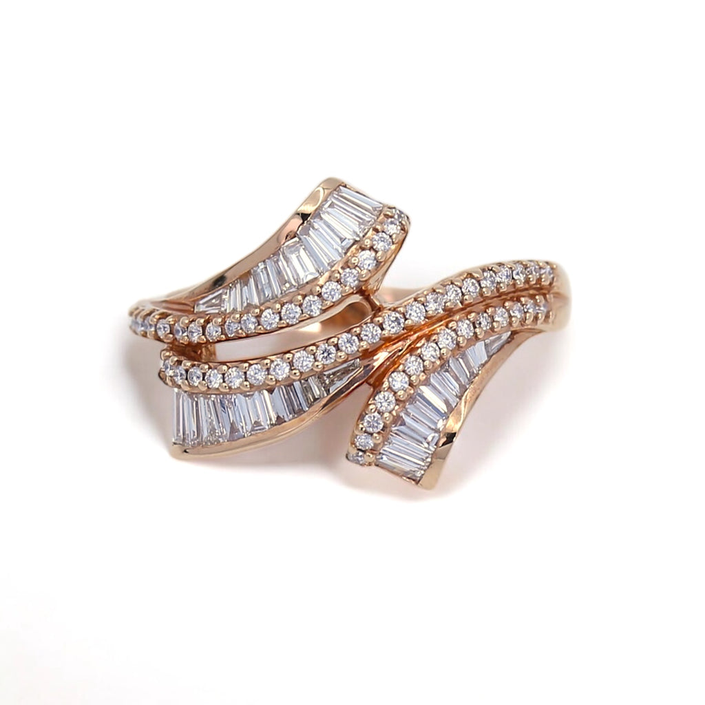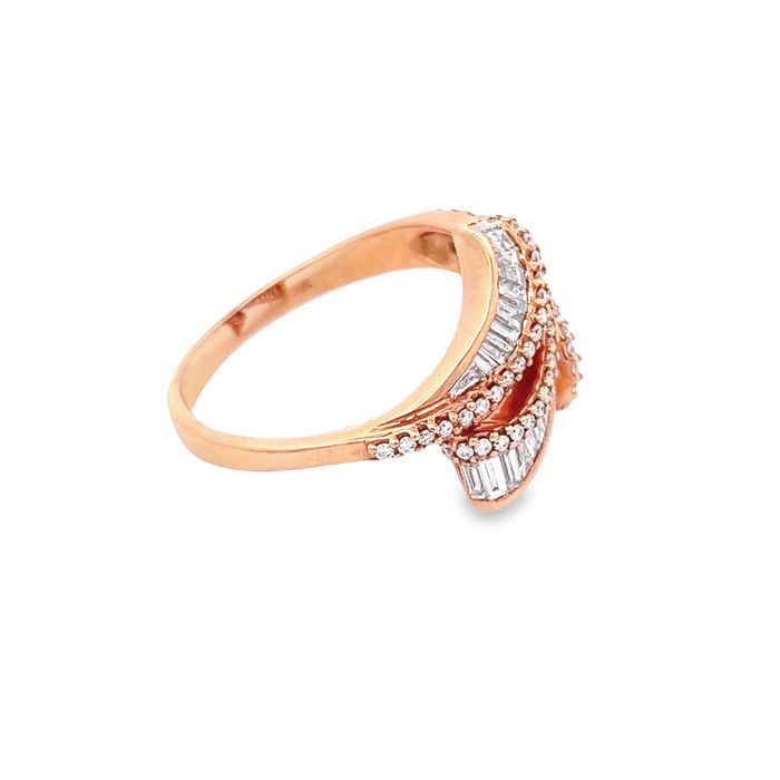 A stunning 18K rose gold ring featuring a beautiful ribbon design set with tapered step cut and round VVS2 brilliant diamonds in a channel setting. Show off your style with this sophisticated and timeless jewelry piece.