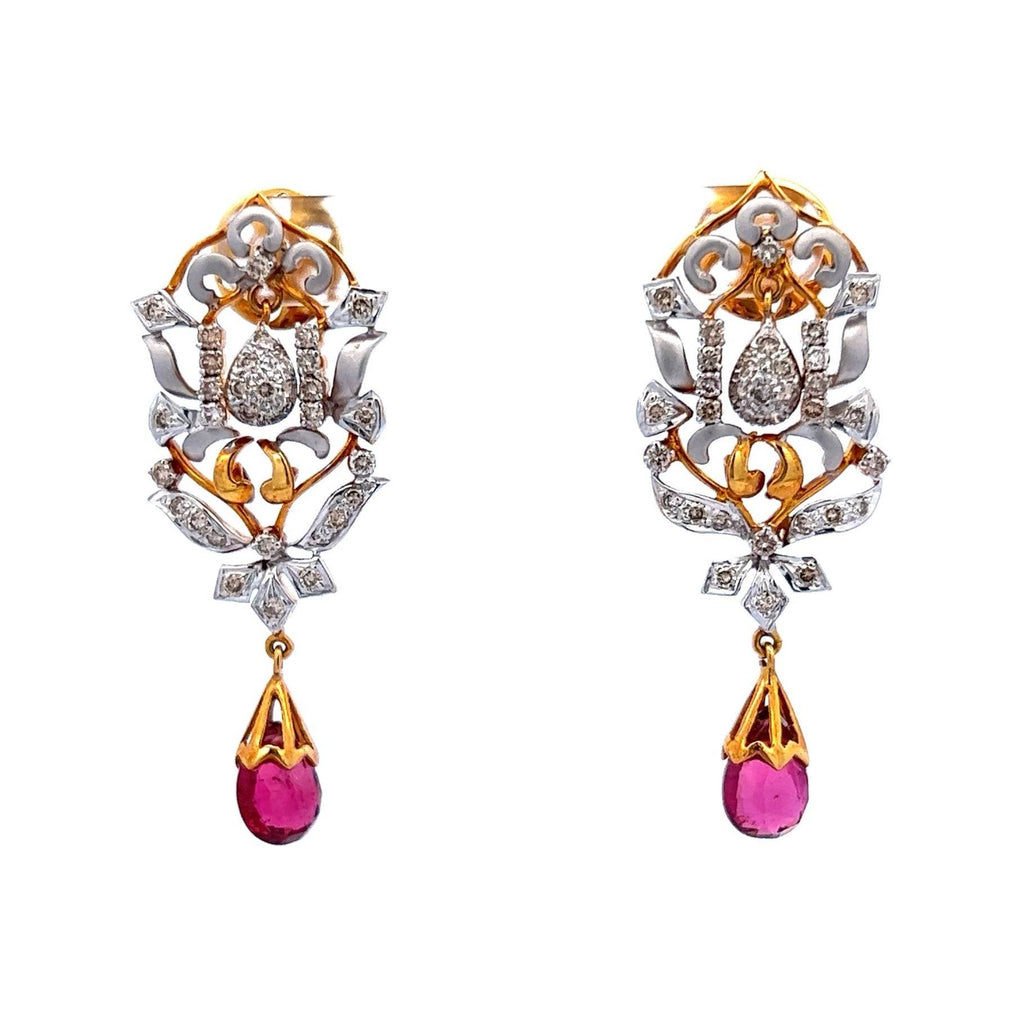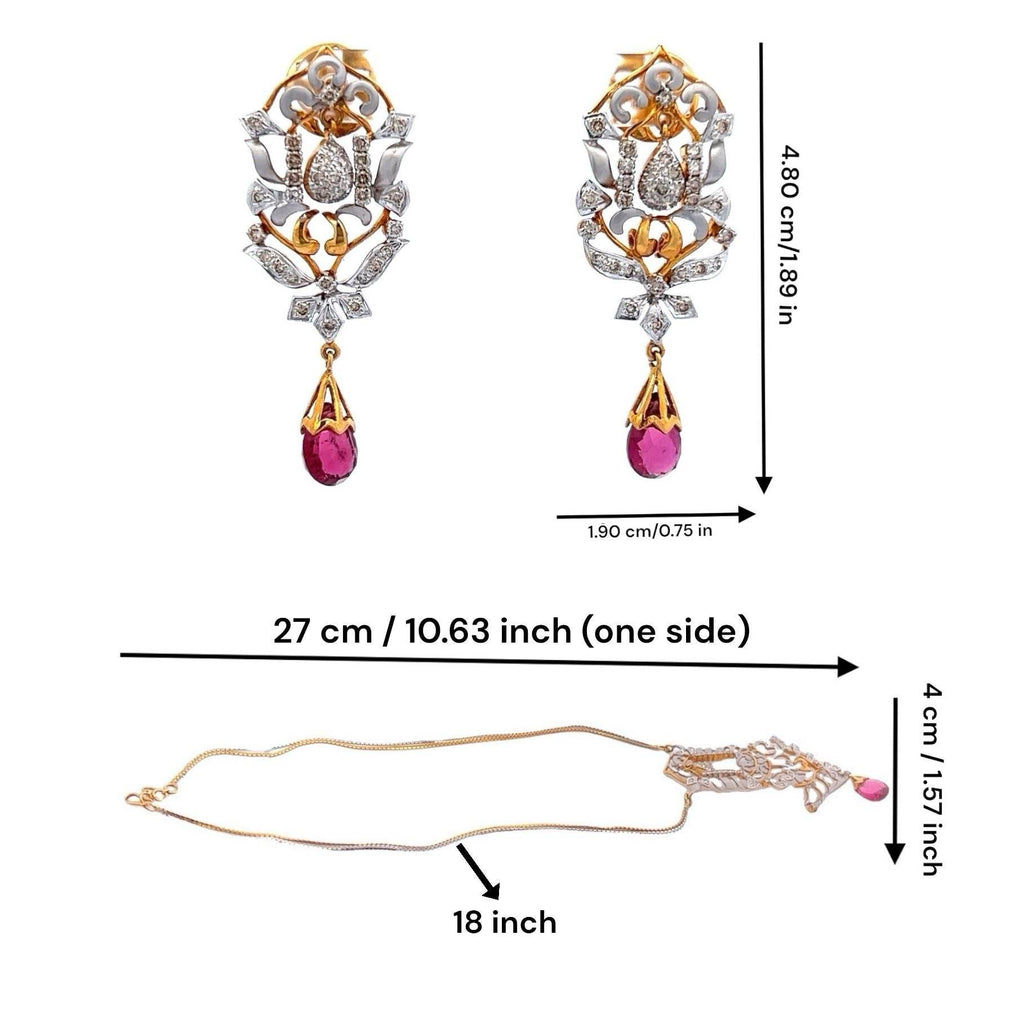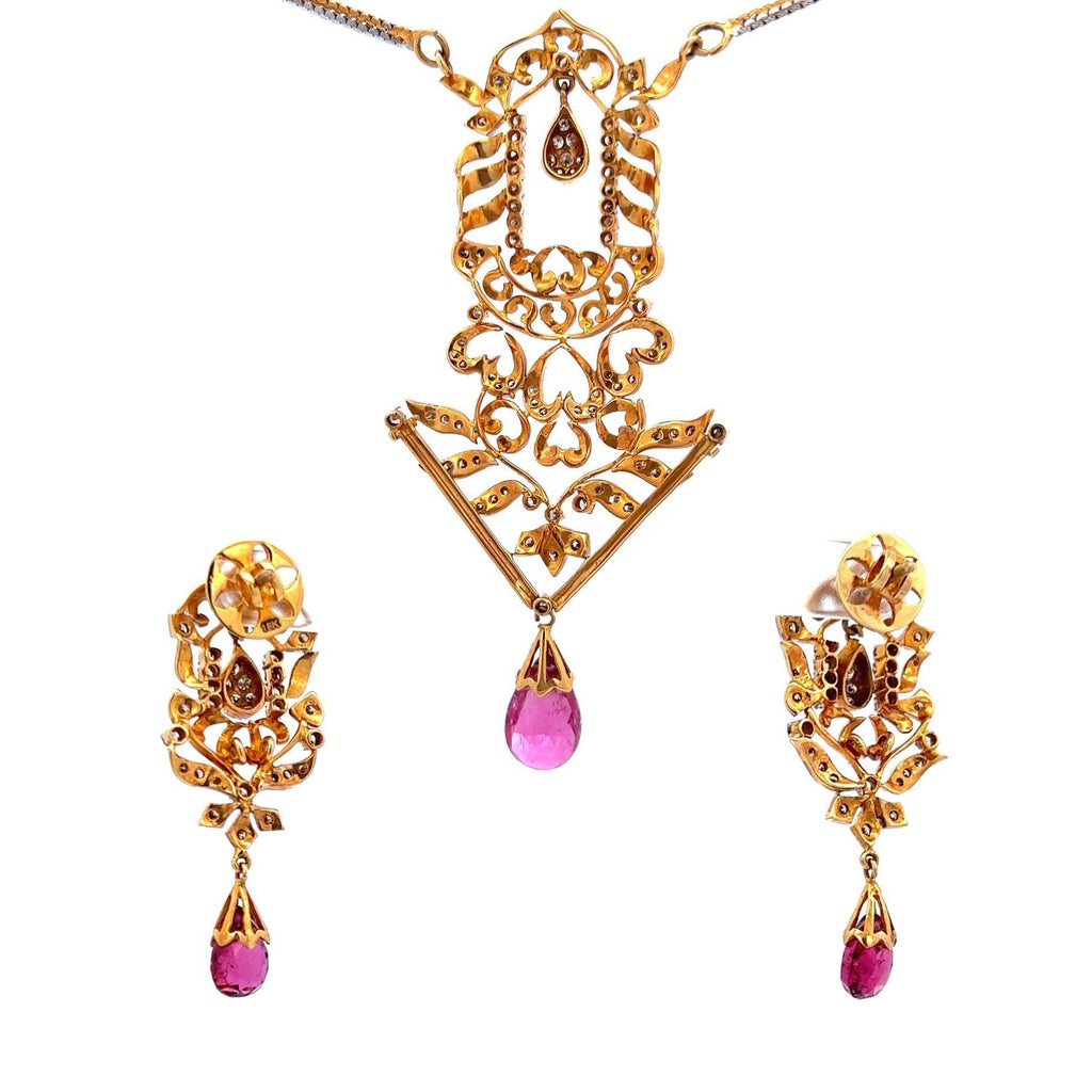 18K Gold Diamond Natural Rubellite Drop Two Tone Necklace Earring Jewelry Set