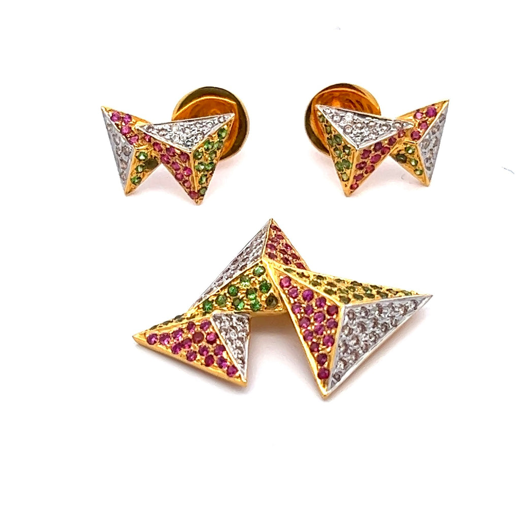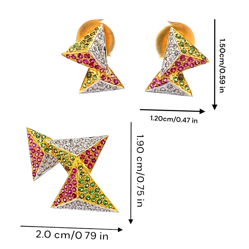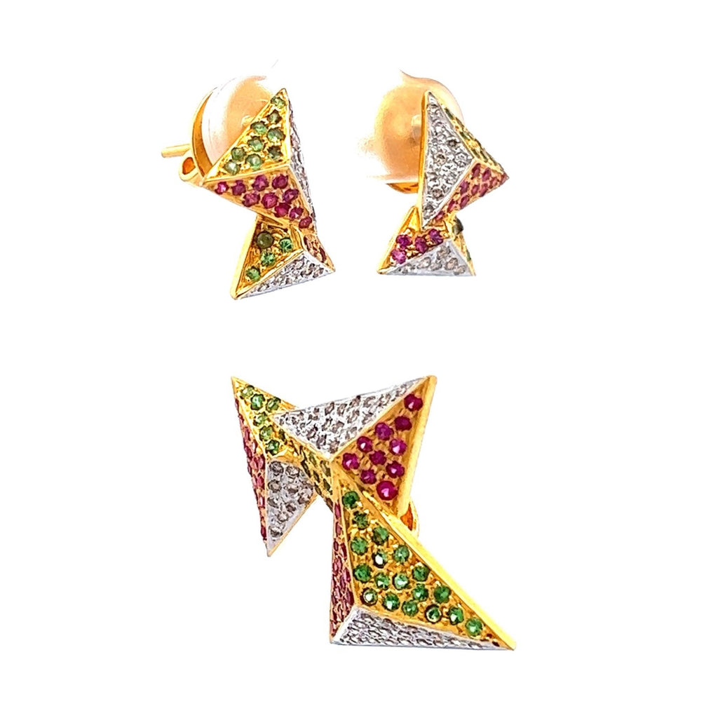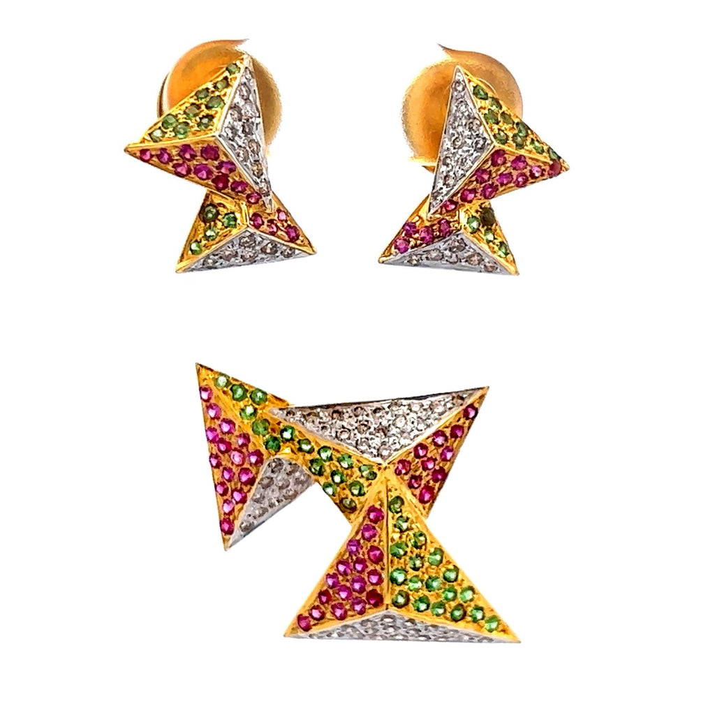 This 18K Two Tone Gold Pendant Earring Set features a modern geometric design, elegantly crafted with natural diamond, ruby, and tsavorite gemstones for a striking and colorful statement.