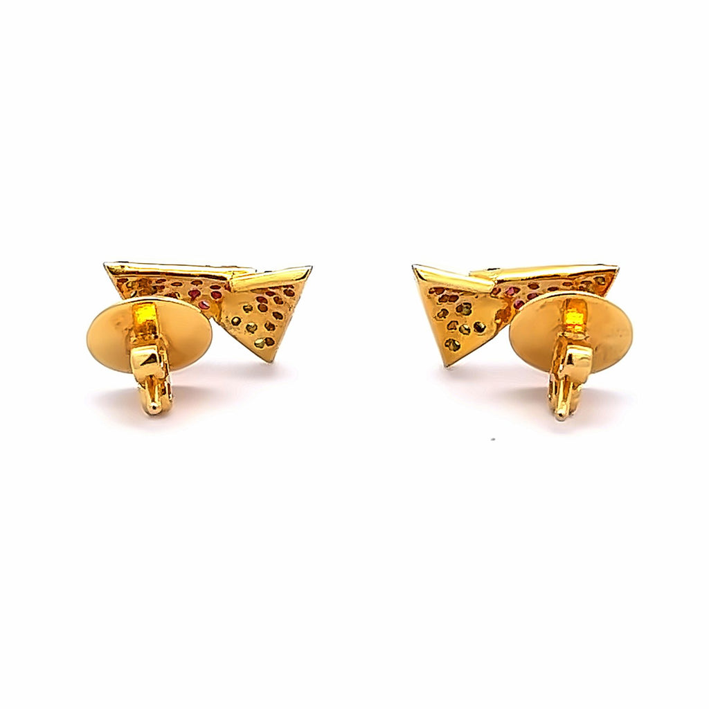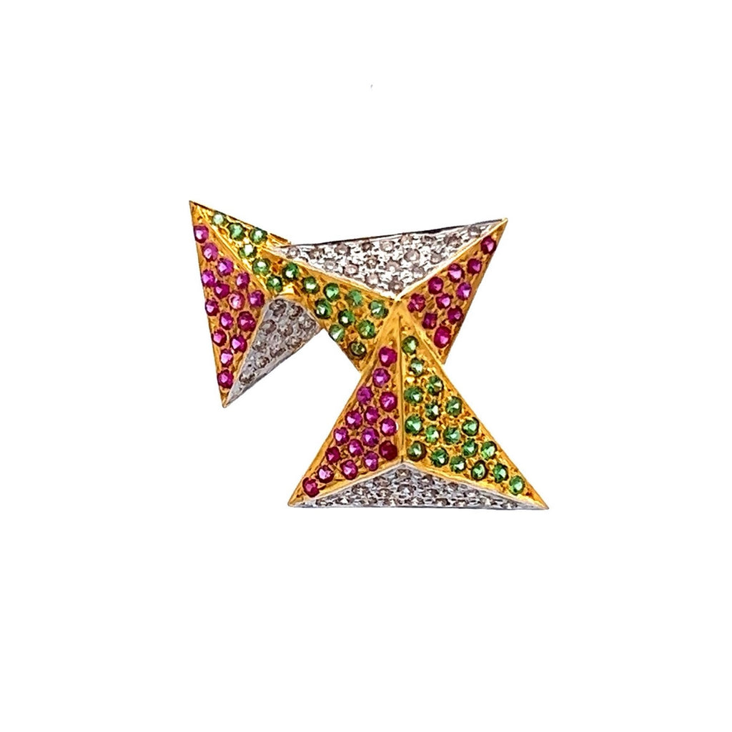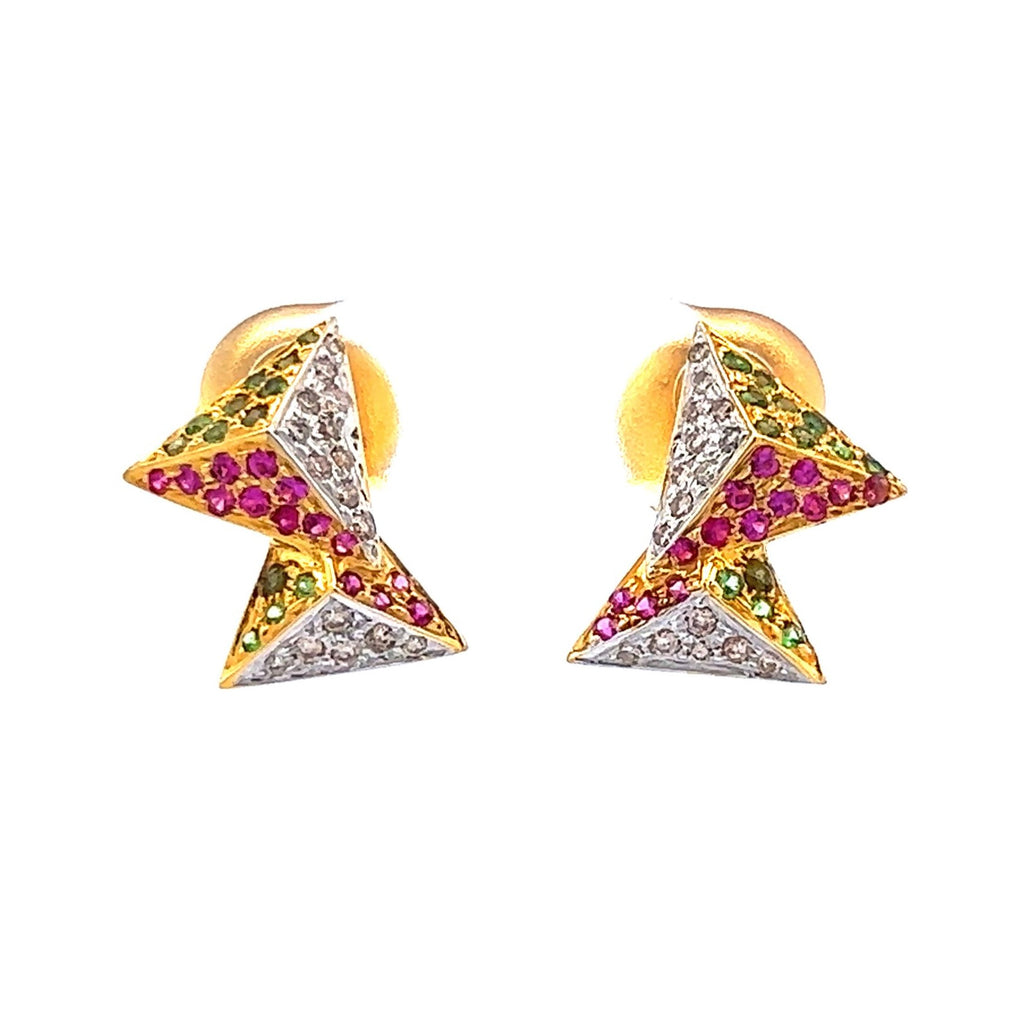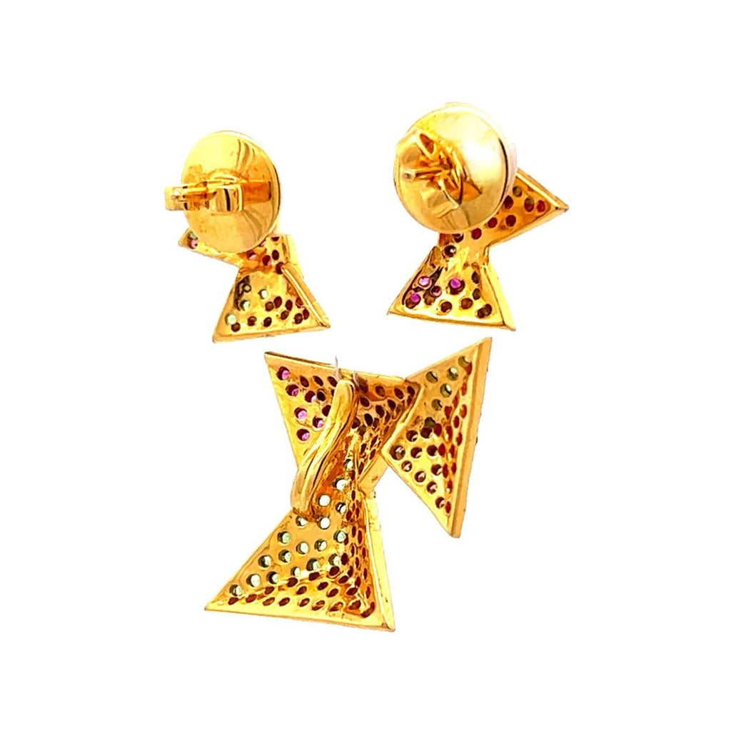 This 18K Two Tone Gold Pendant Earring Set features a modern geometric design, elegantly crafted with natural diamond, ruby, and tsavorite gemstones for a striking and colorful statement.