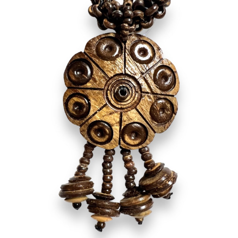 Natural Handmade Necklace Shaded Coconut Shell Carved Dotted Tassel Unique Jewelry