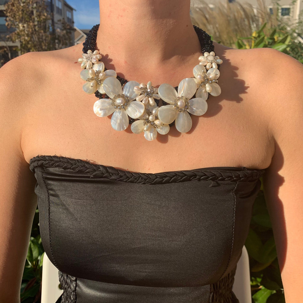 Handmade Choker 20" Unique Black Onyx Sea Shells Floral Bib Necklace