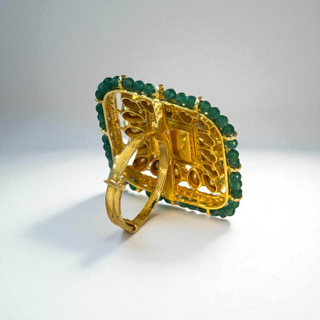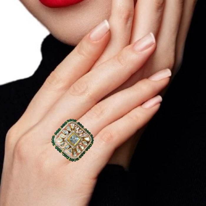 This ring blends the grandeur of traditional Indian bridal jewelry with a modern twist—perfect for weddings, celebrations, or heirloom-style fashion. Each detail echoes the craftsmanship of royal Mughal aesthetics, offering unmatched sparkle and cultural richness.