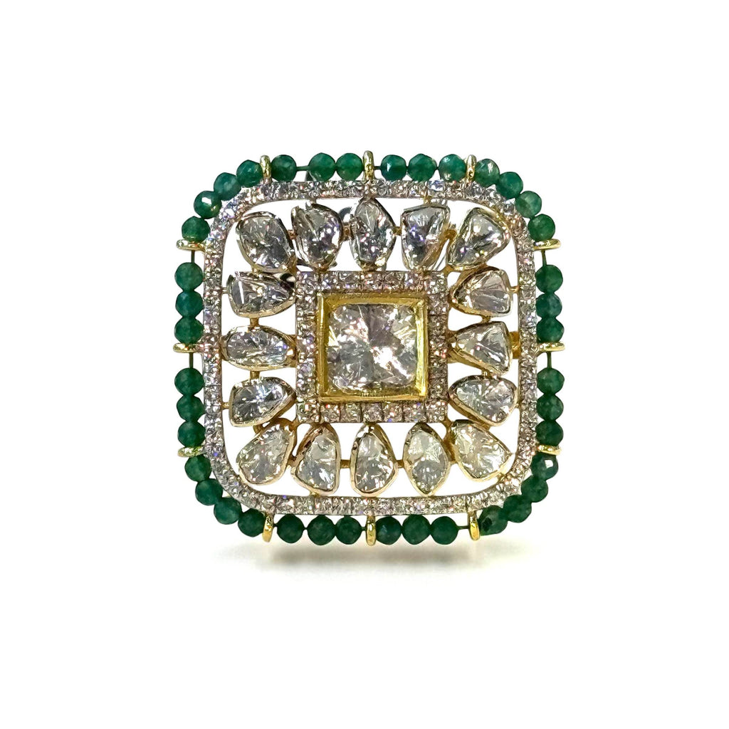 Celebrate the exquisite Mughal-era aesthetic with this stunning 14K Yellow Gold Diamond Polki Emerald Ring, a regal fusion of traditional craftsmanship and vibrant gemstone accents. Featuring natural uncut Polki diamonds paired with rich emeralds, this ring captures the grandeur and elegance of Royal Indian jewelry heritage.