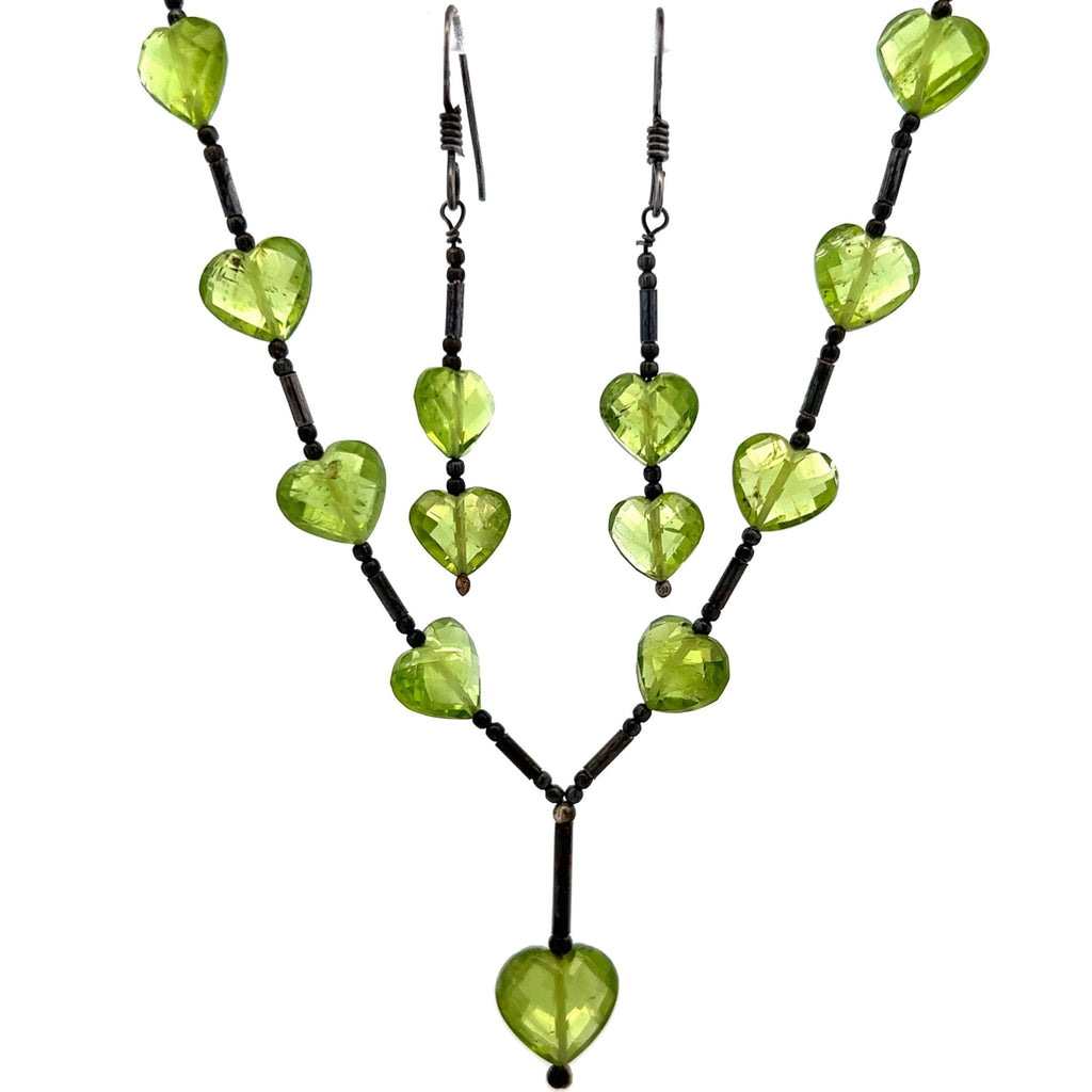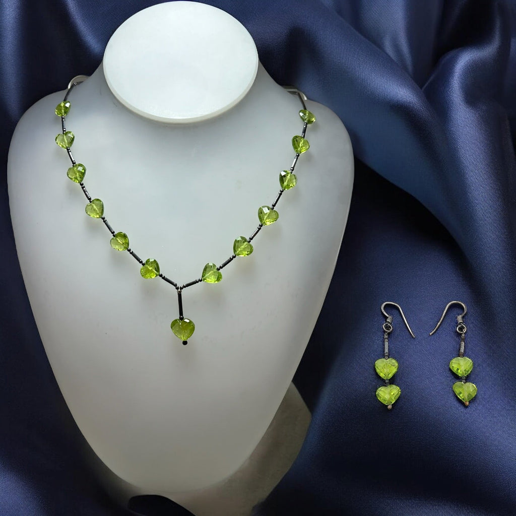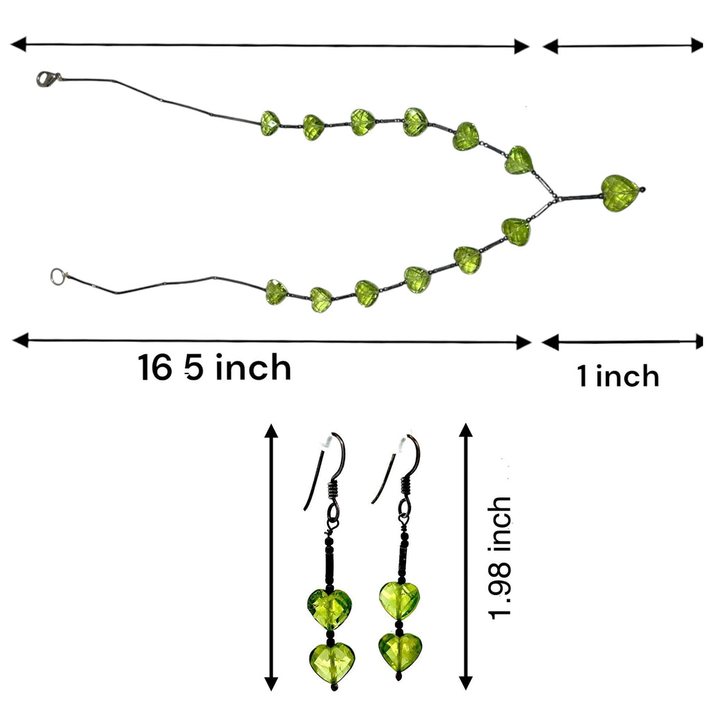 Natural Peridot Briolette Heart Gemstone Station Style Necklace Earring Set