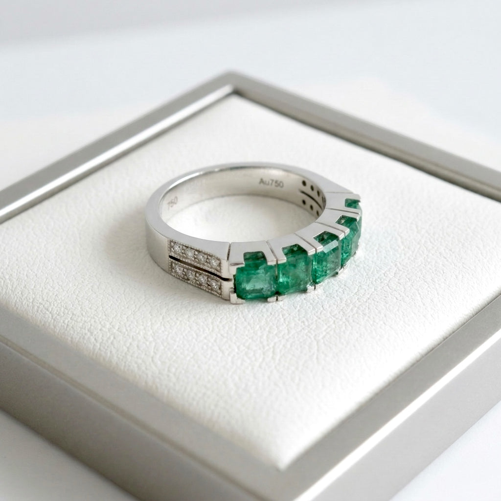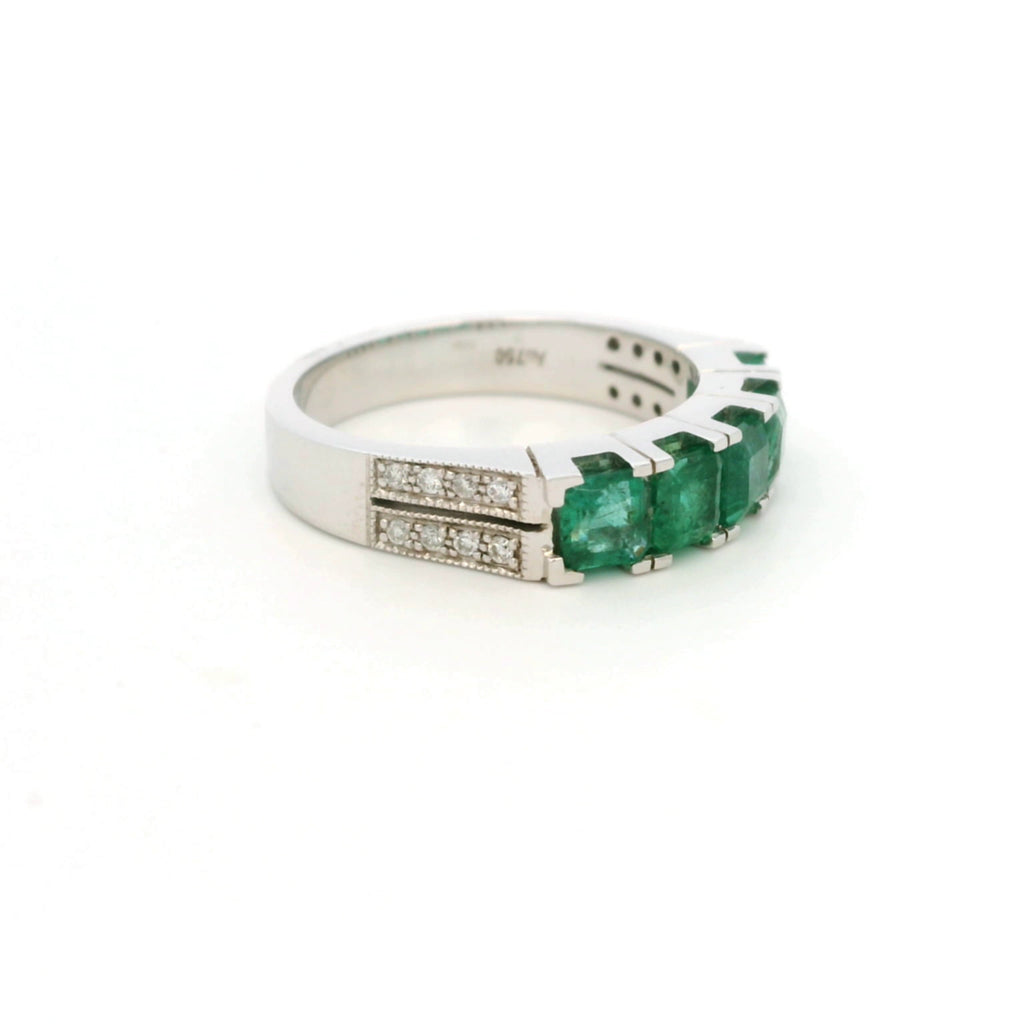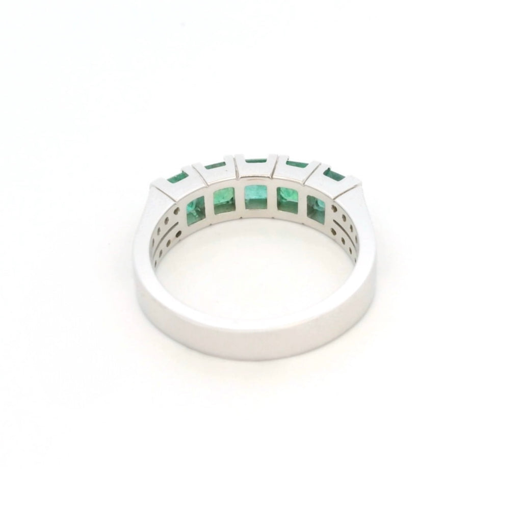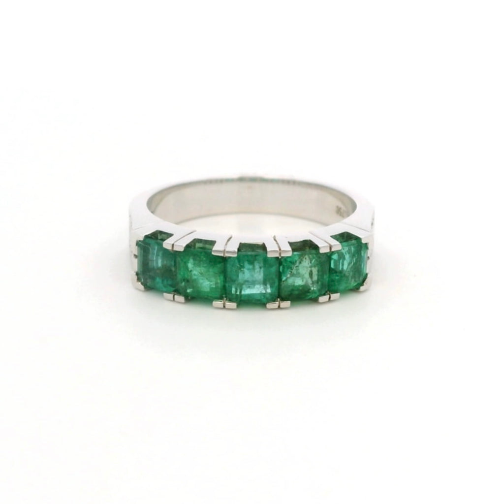 Celebrate refined sophistication with this striking 18K white gold five-stone Emerald & Diamond band ring, designed to showcase vibrant color and brilliant contrast. Five captivating natural square-cut Emeralds form the centerpiece, symbolizing harmony and timeless elegance.