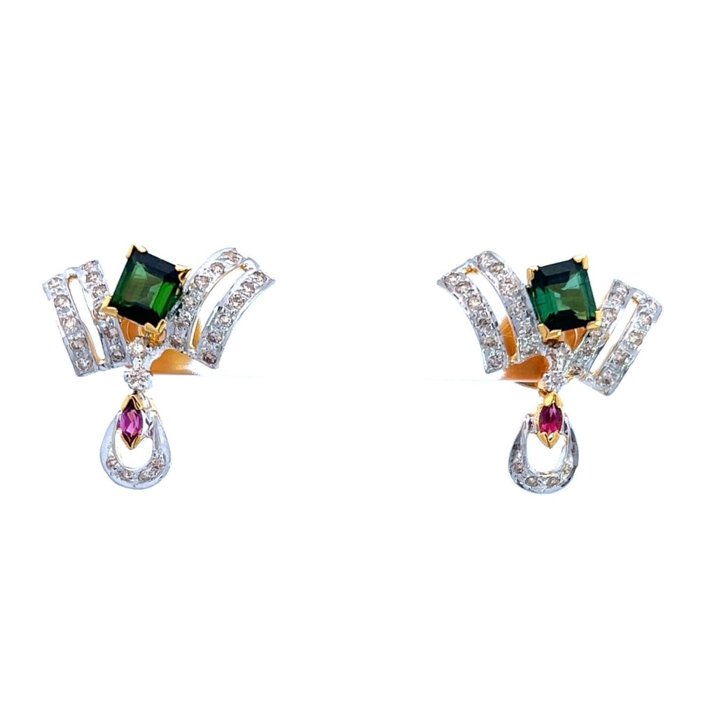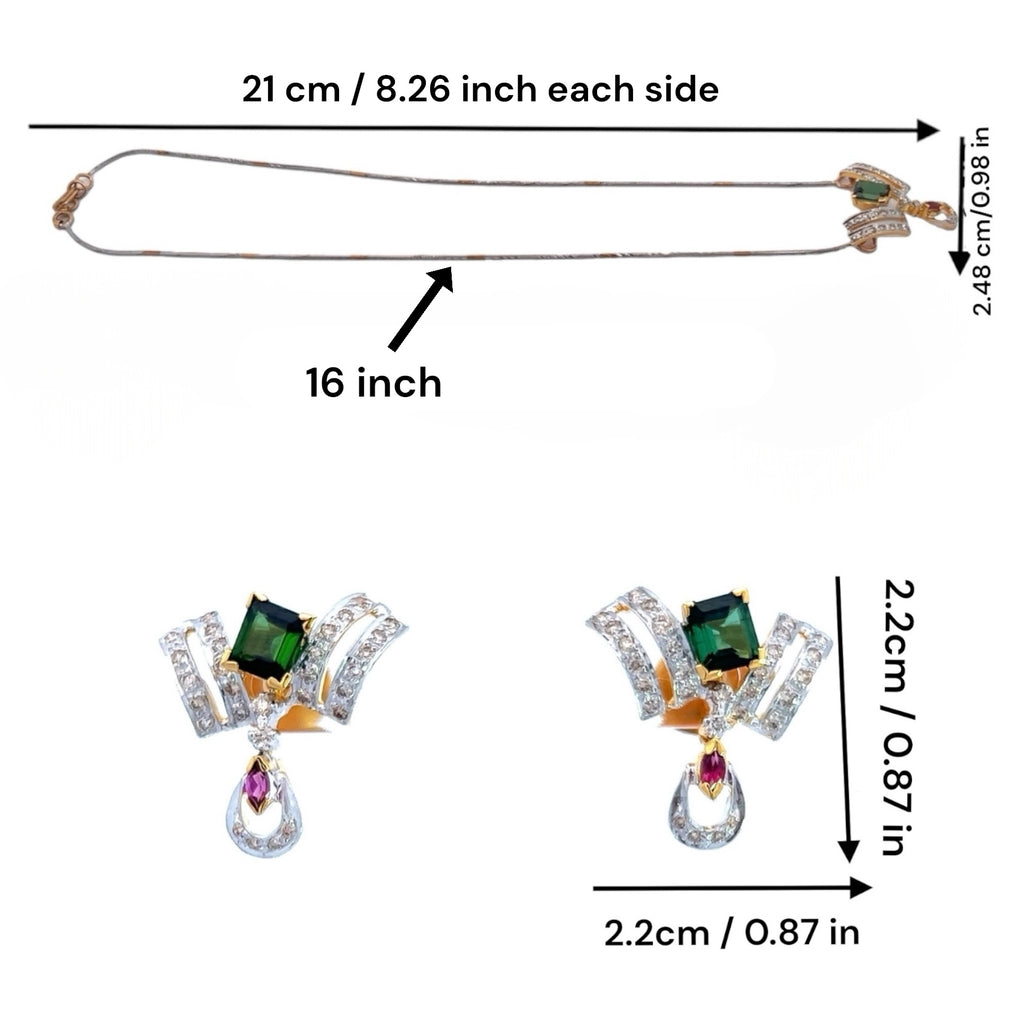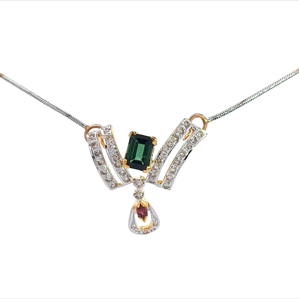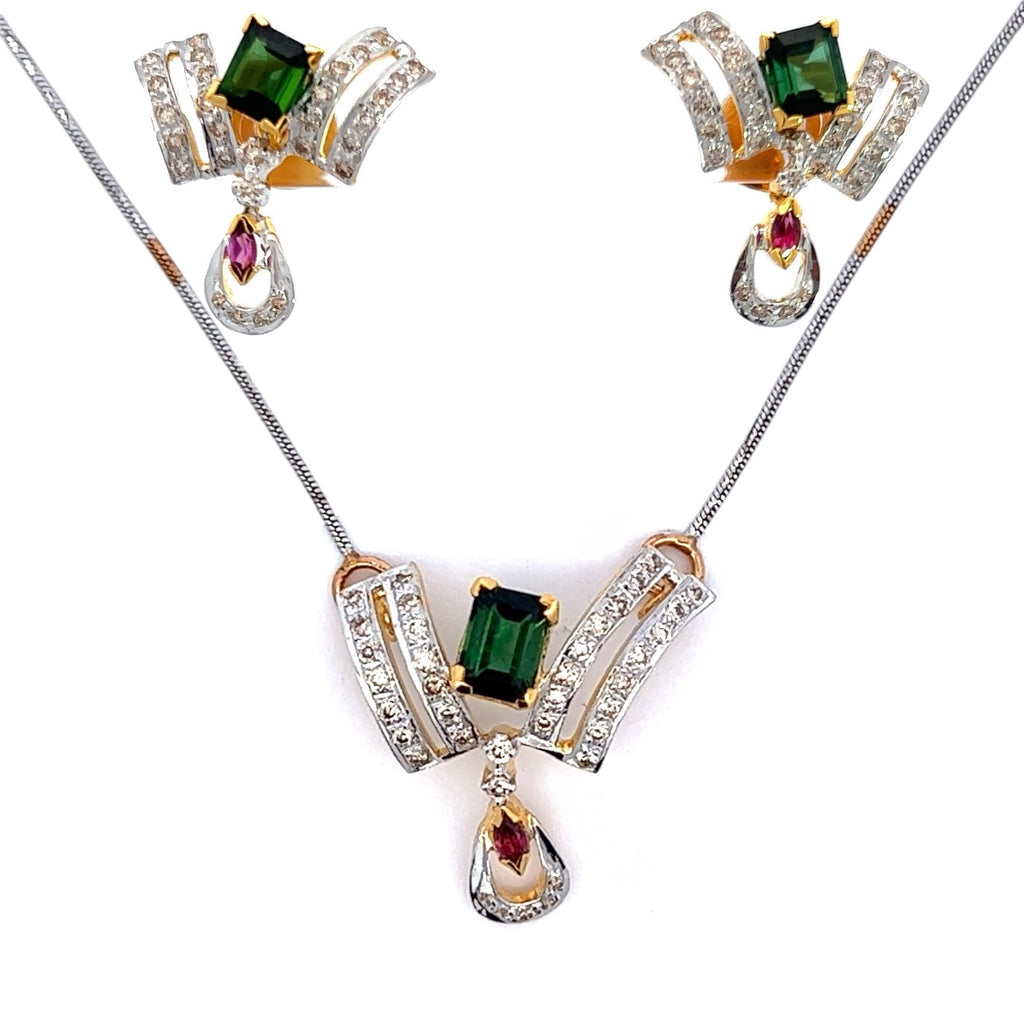 Celebrate refined elegance with this beautifully crafted 18K Two Tone Gold Pendant, Chain, and Earring Set, featuring natural diamonds and radiant green tourmaline gemstones. The combination of yellow and white gold offers a balanced, timeless look, perfect for those who appreciate sophisticated, layered design.