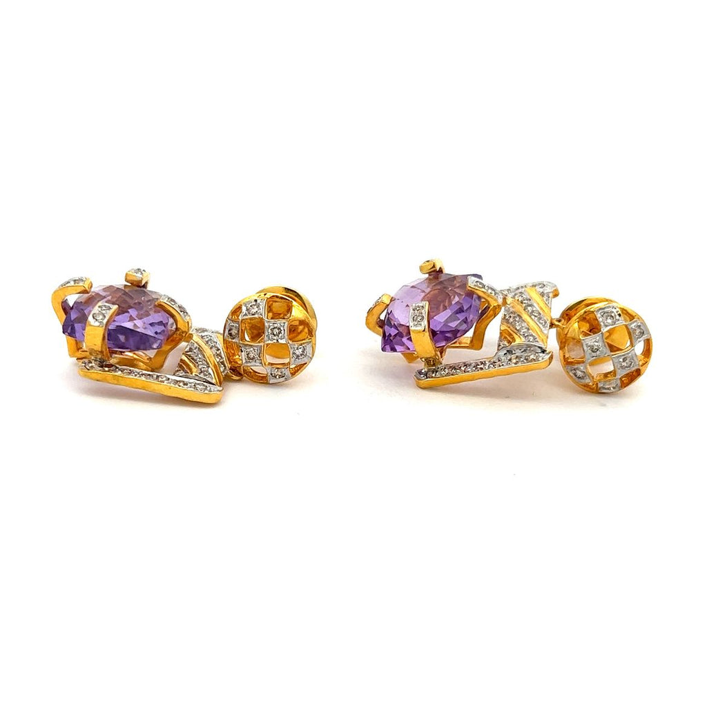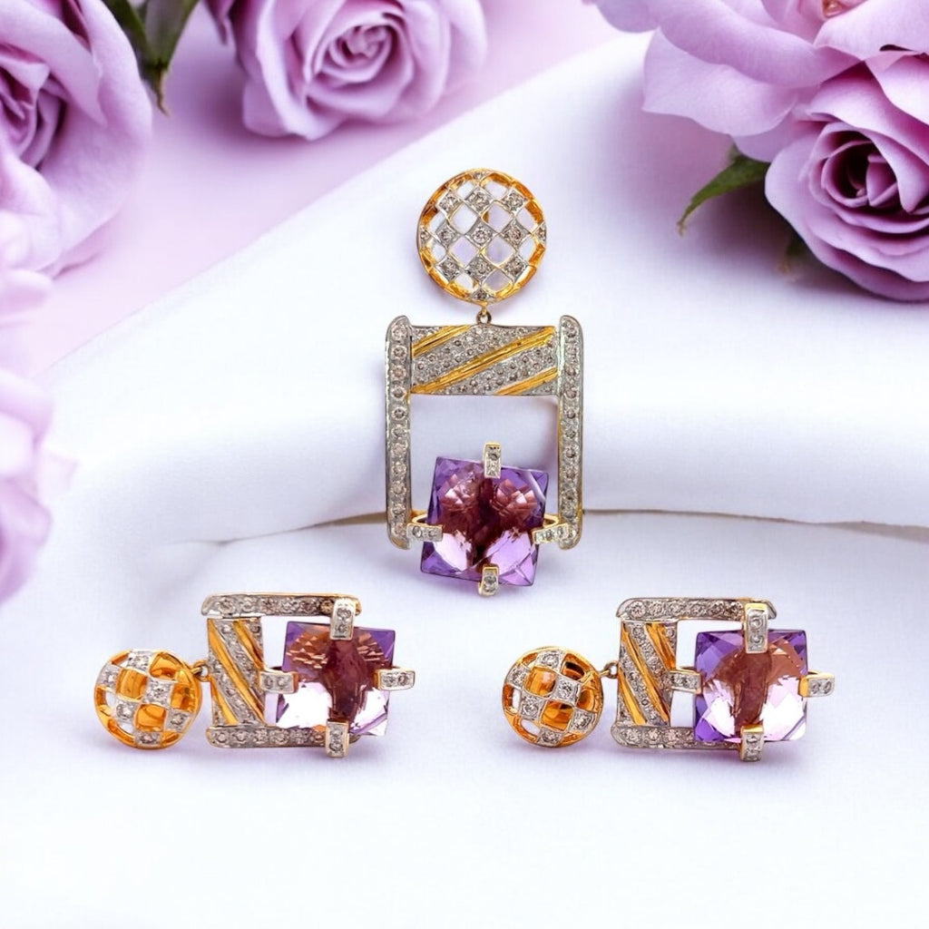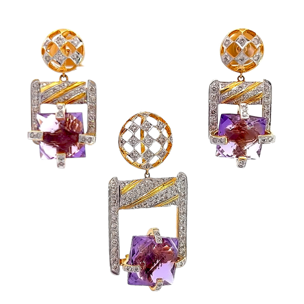 18K Two Tone Gold Natural Diamond & Amethyst Pendant Earring Set Jewelry