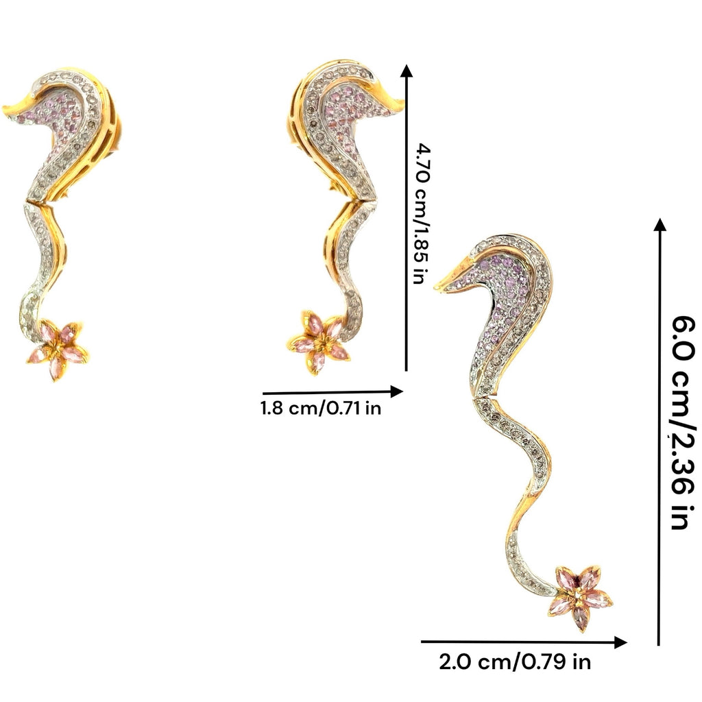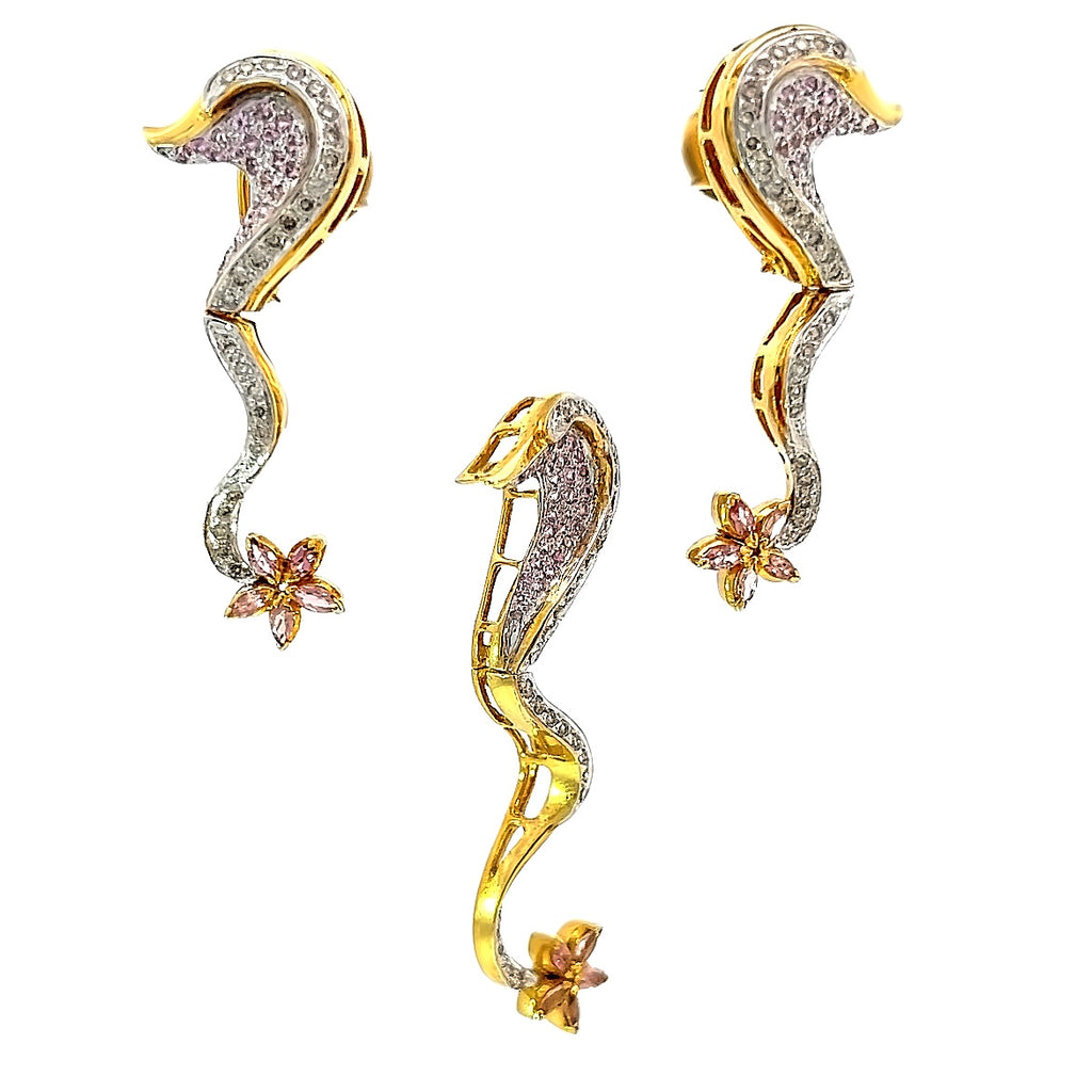 18K Two Tone Gold Natural Diamond & Pink Sapphire Pendant Earring Set Sea Horse Design Jewelry