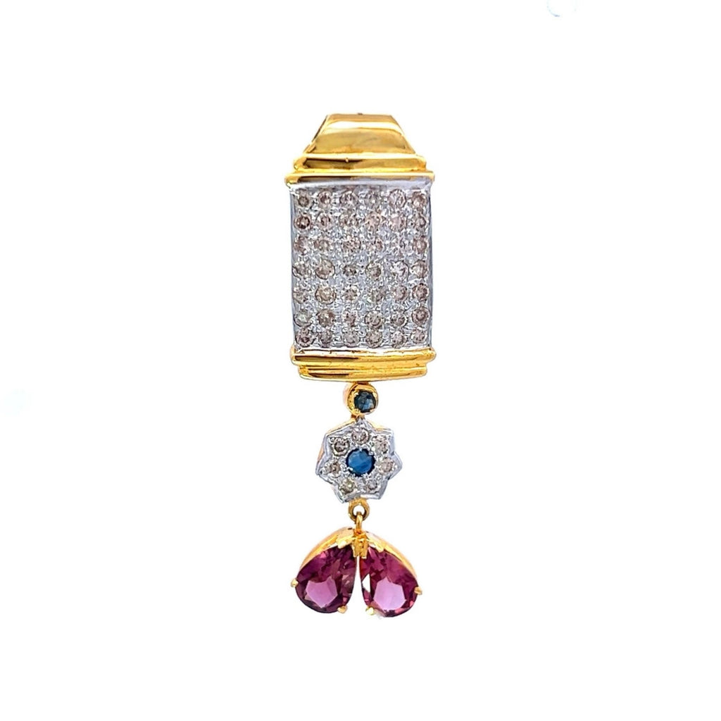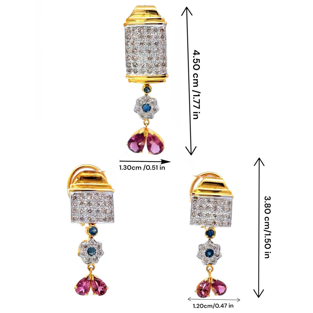 This 18K Two Tone Gold Pendant and Earring Set showcases a delicate blend of natural diamond and pink tourmaline gemstones, creating a graceful and timeless design suitable for both special occasions and everyday elegance.