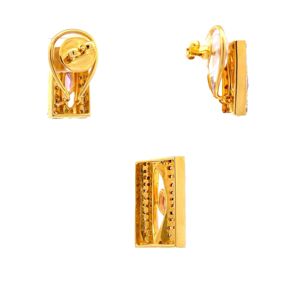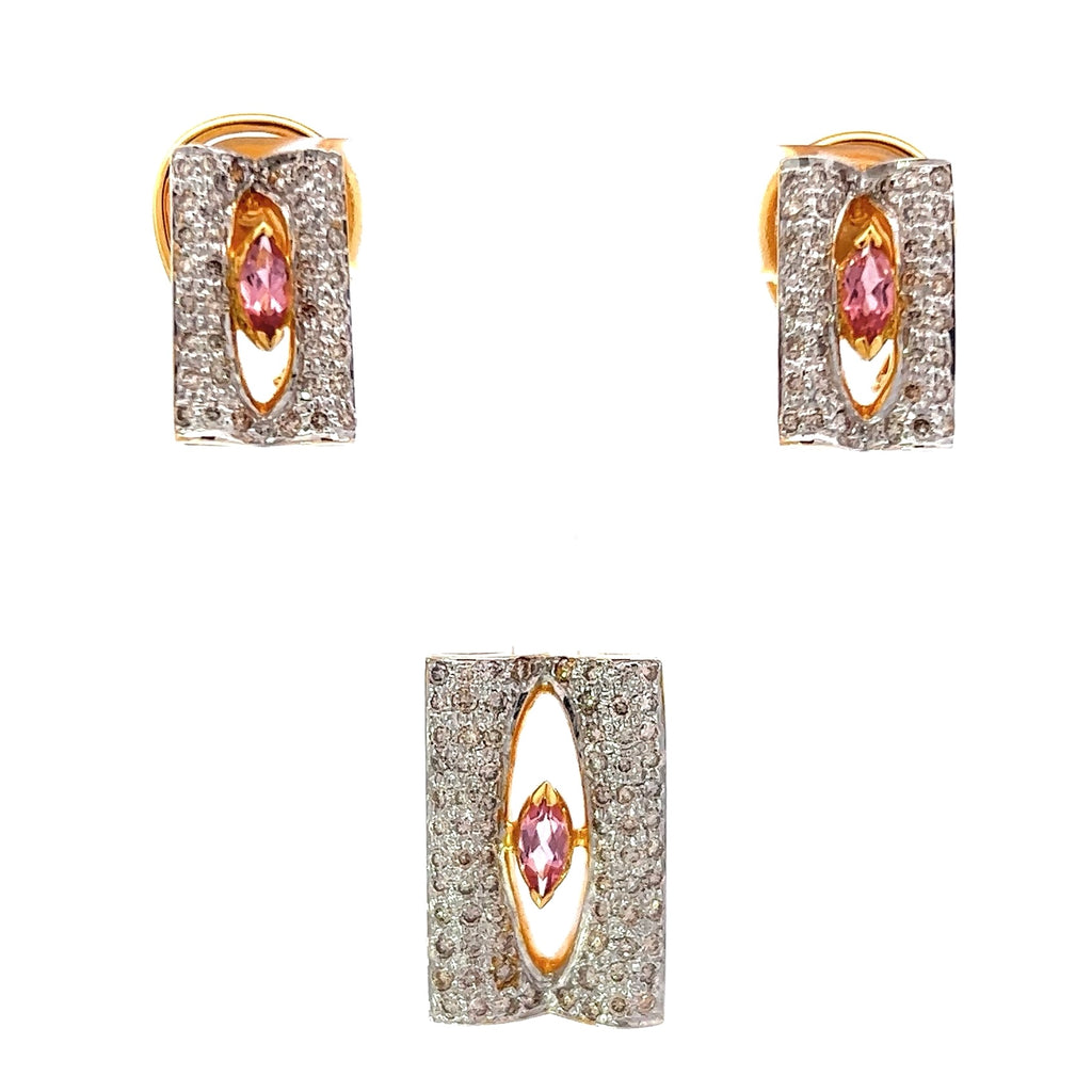 18K Two Tone Gold Natural Diamond & Pink Tourmaline Pendant Earring Set Jewelry