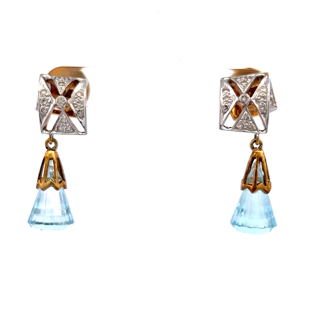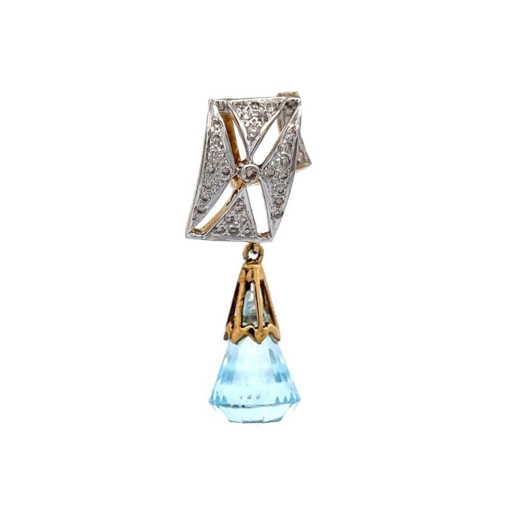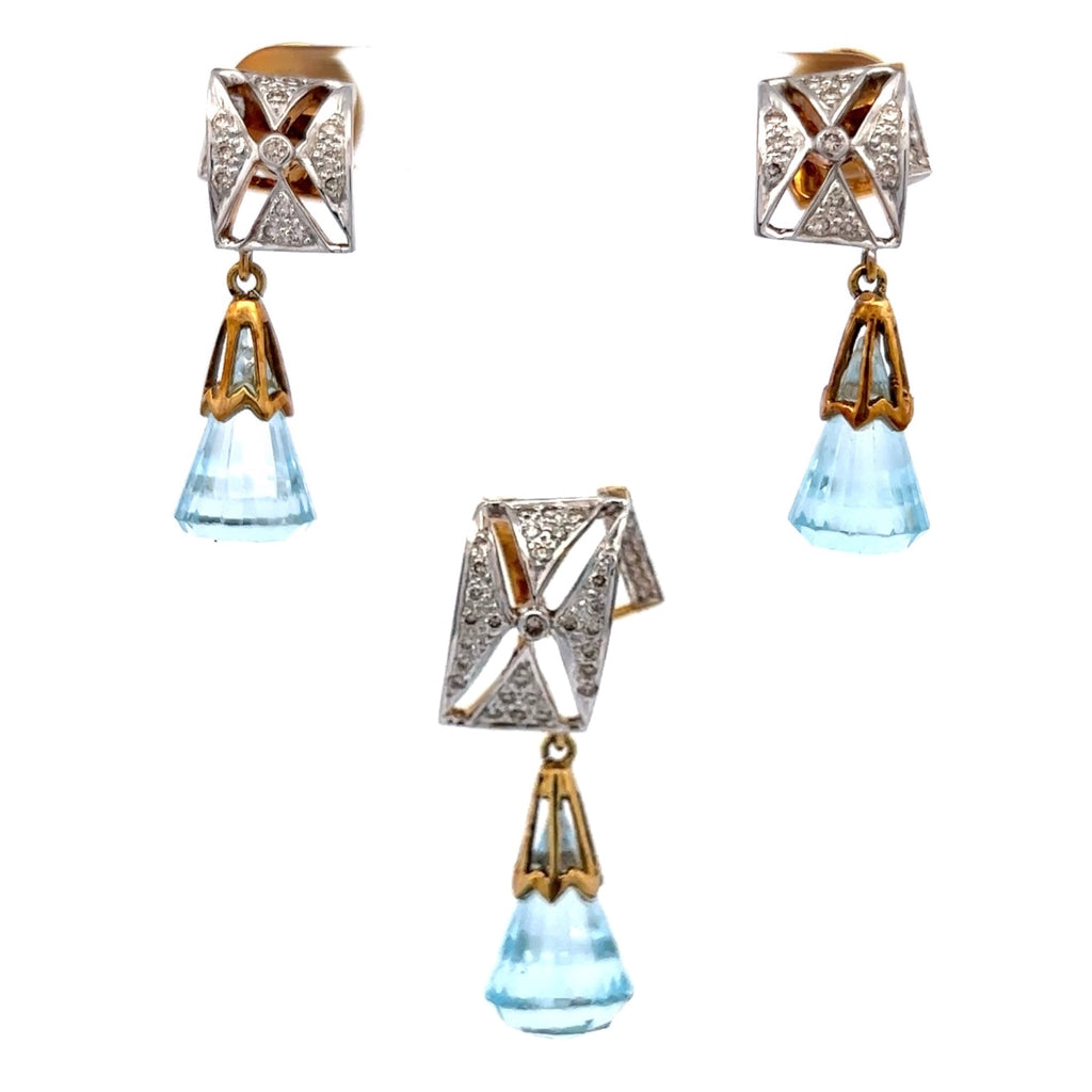 18K Two Tone Gold Natural Diamond & Swiss Blue Topaz Pendant Earring Set Jewelry
