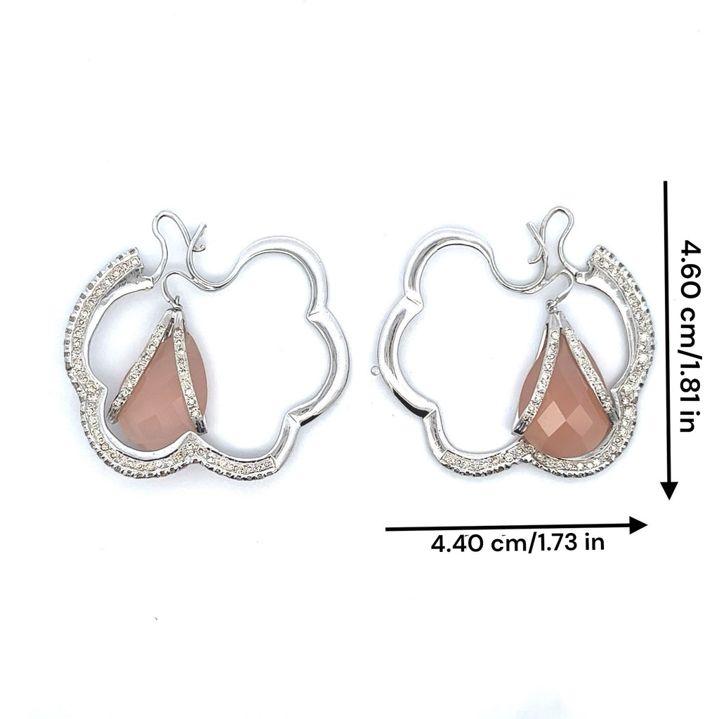 These 18K white gold diamond pink chalcedony hoop earrings exude beauty and elegance. Accented with a natural white round diamond strip and featuring a faceted drop pink chalcedony gemstone floral design, these hoop earrings are sure to take your look to the next level. The hinged hoop lock mechanism ensures a secure and comfortable fit that will last.