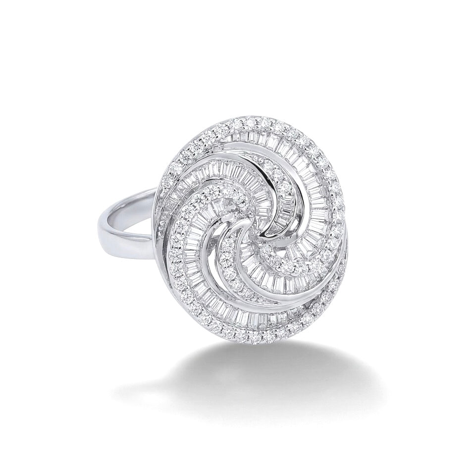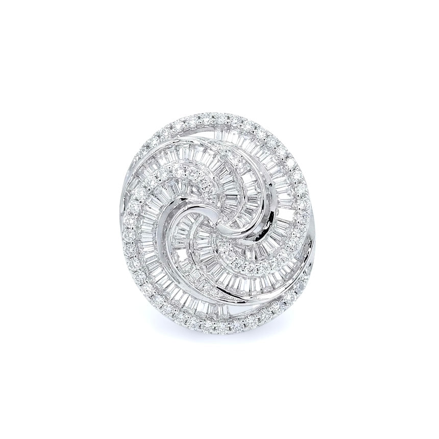 The striking circular swirl design is layered with shimmering channel-set baguette diamonds and radiant round brilliant pavé stones, creating exceptional depth and movement. The sculptural spiral silhouette delivers dramatic sparkle from every angle.