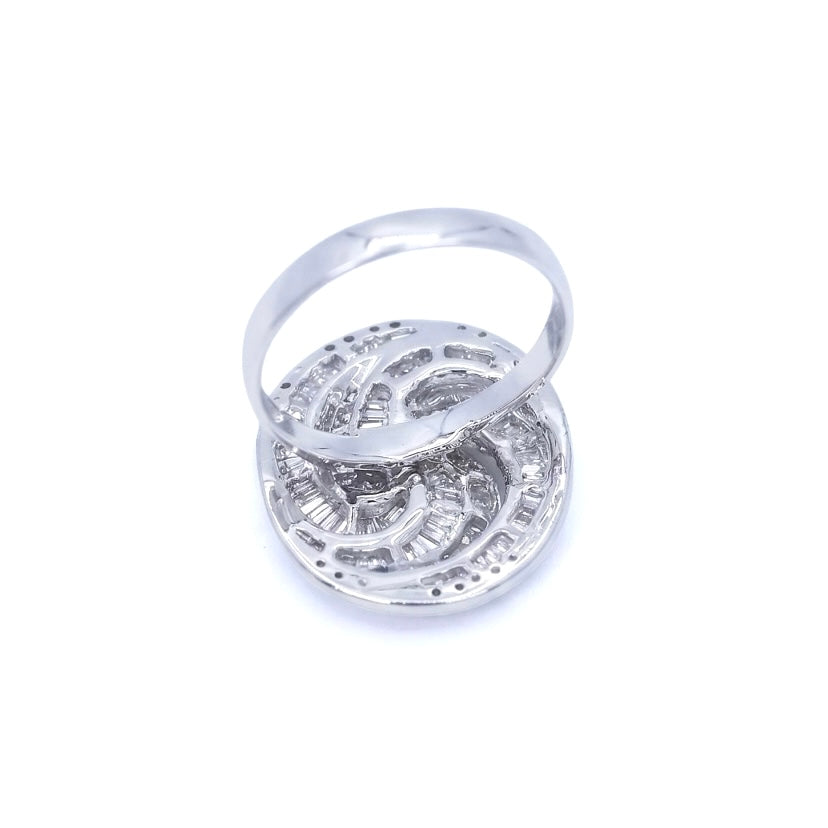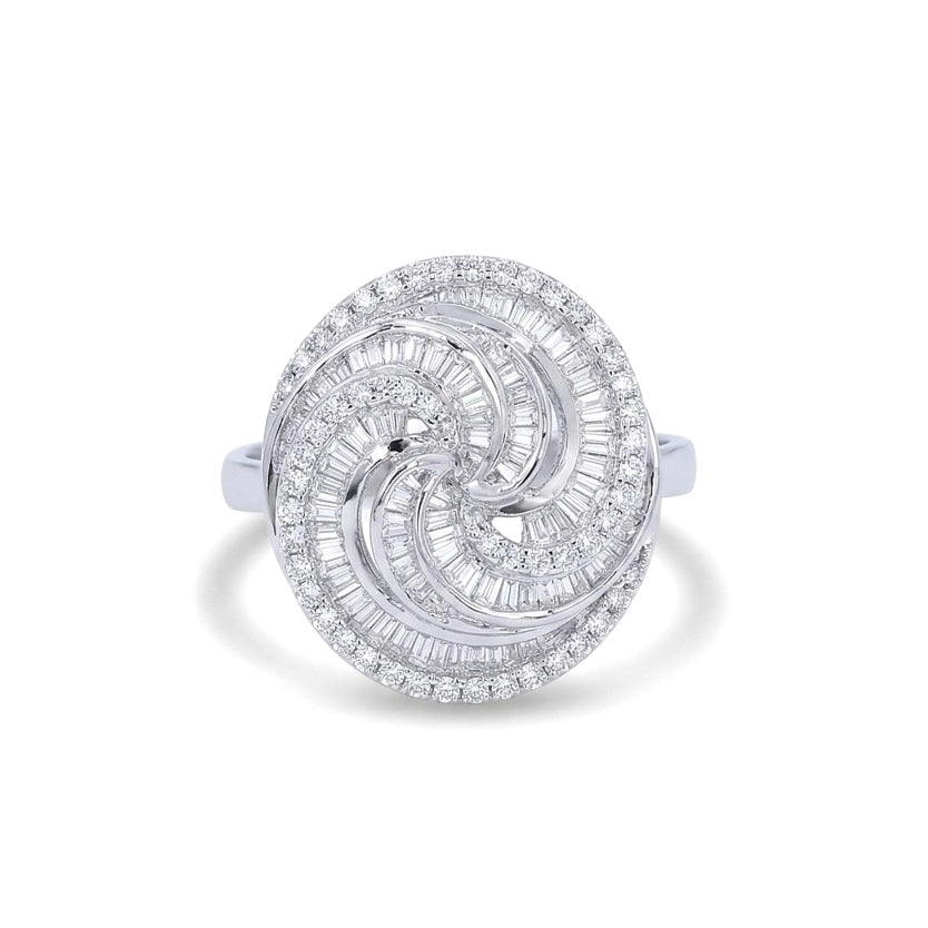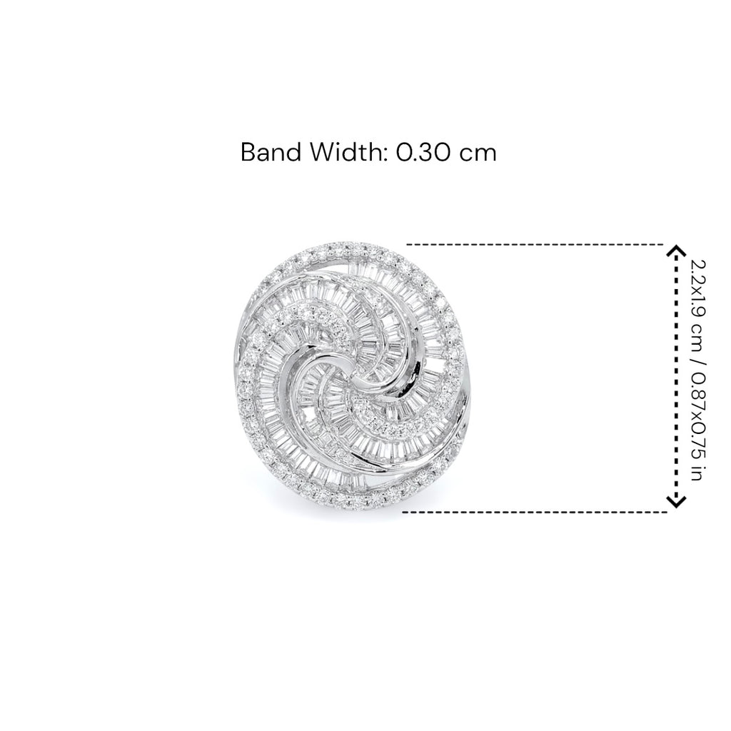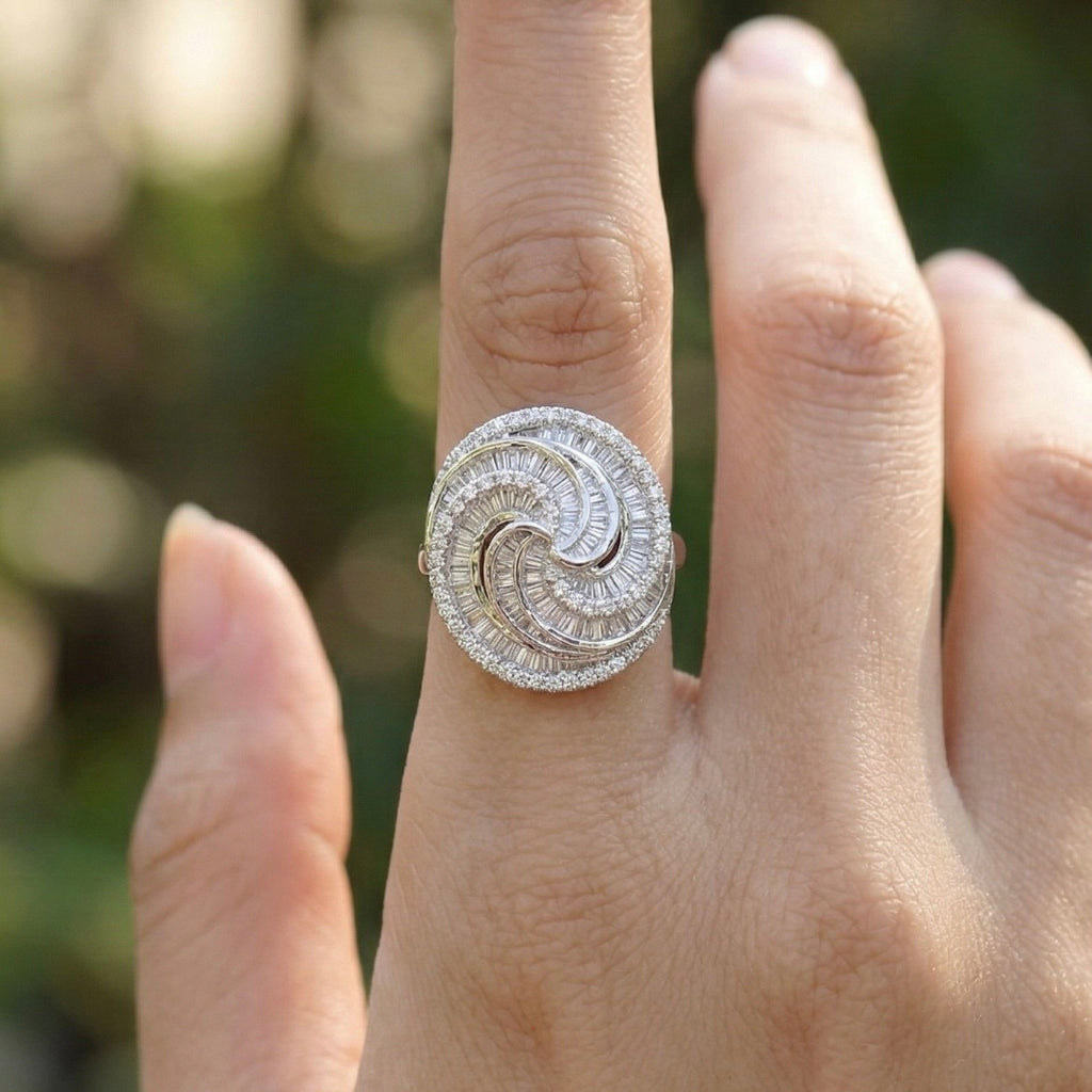 18K White Gold Spiral Cocktail Statement Ring | Natural Diamond Baguette & Round Swirl Design | Bold Luxury Gift