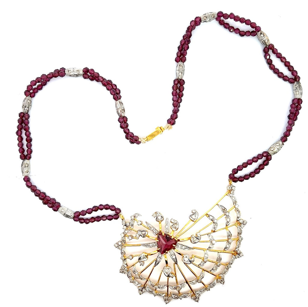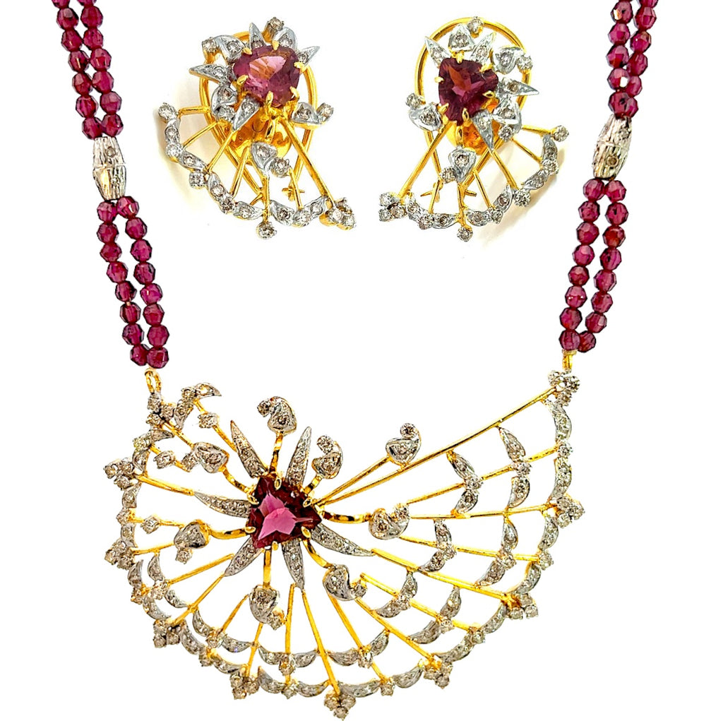 18K Gold Natural Diamond & Pink Tourmaline/Rhodolite Earring Necklace Set Jewelry