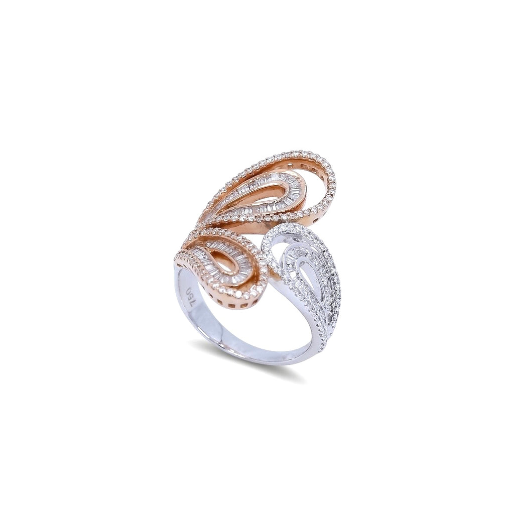 Celebrate graceful movement and modern artistry with this stunning 18K white & rose gold tri-leaf swirl statement ring, adorned with brilliant natural Diamonds.