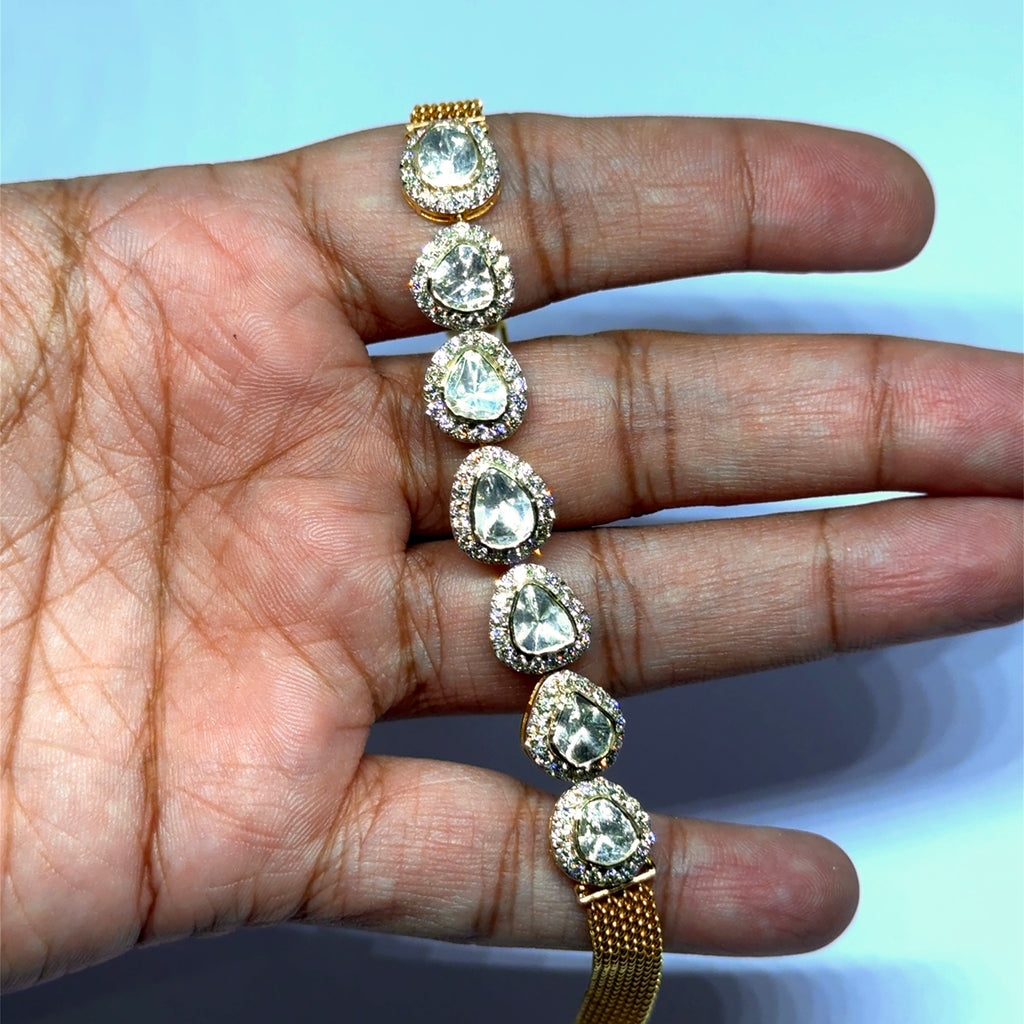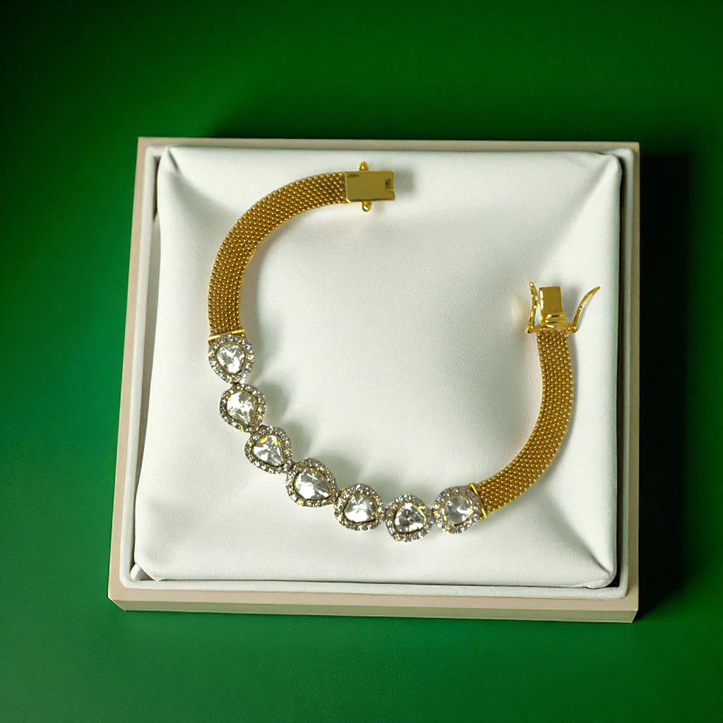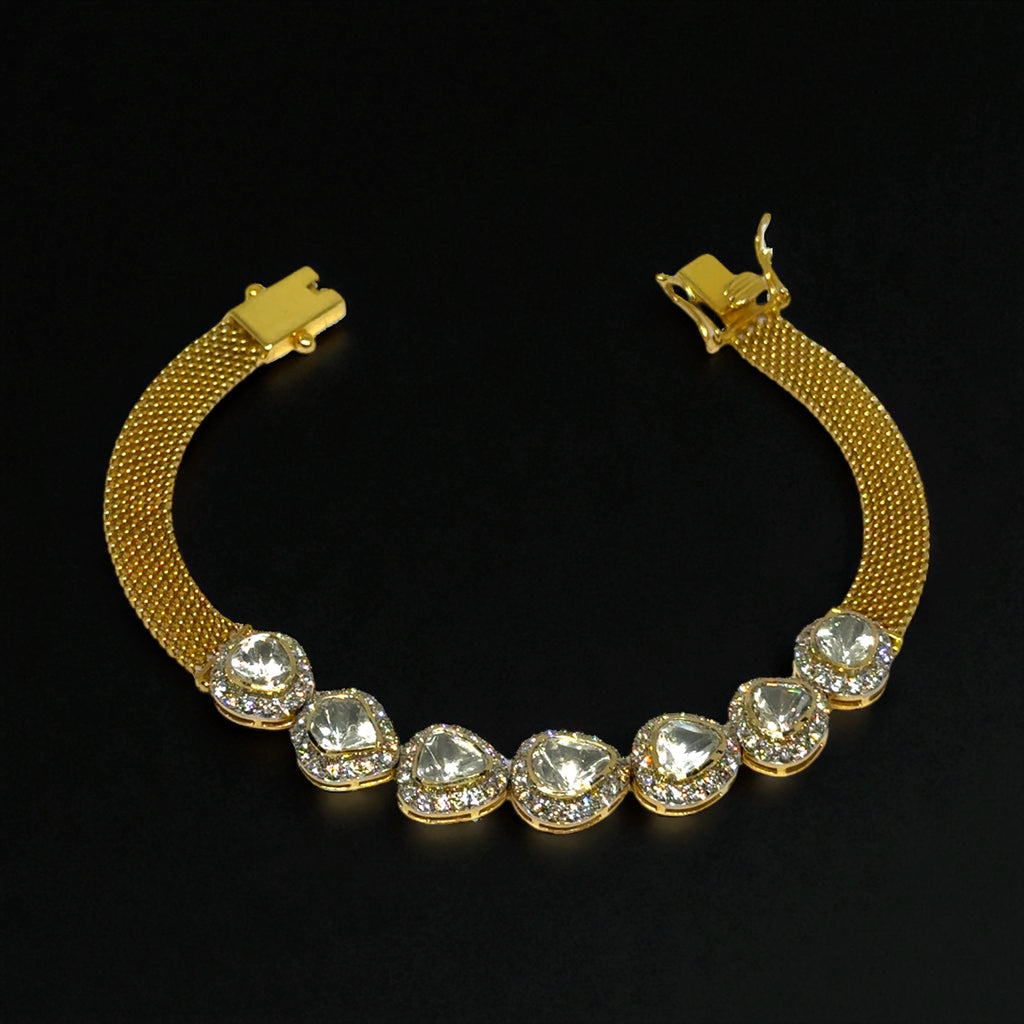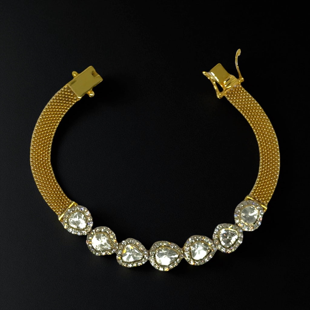 Celebrate the timeless beauty of Indian craftsmanship with this 18K Yellow Gold Diamond Polki Bracelet, an elegant piece that pays homage to traditional Indian jewelry artistry. Handcrafted in rich 18K yellow gold, this bracelet features natural uncut Polki diamonds, known for their raw, regal sparkle and heritage appeal.