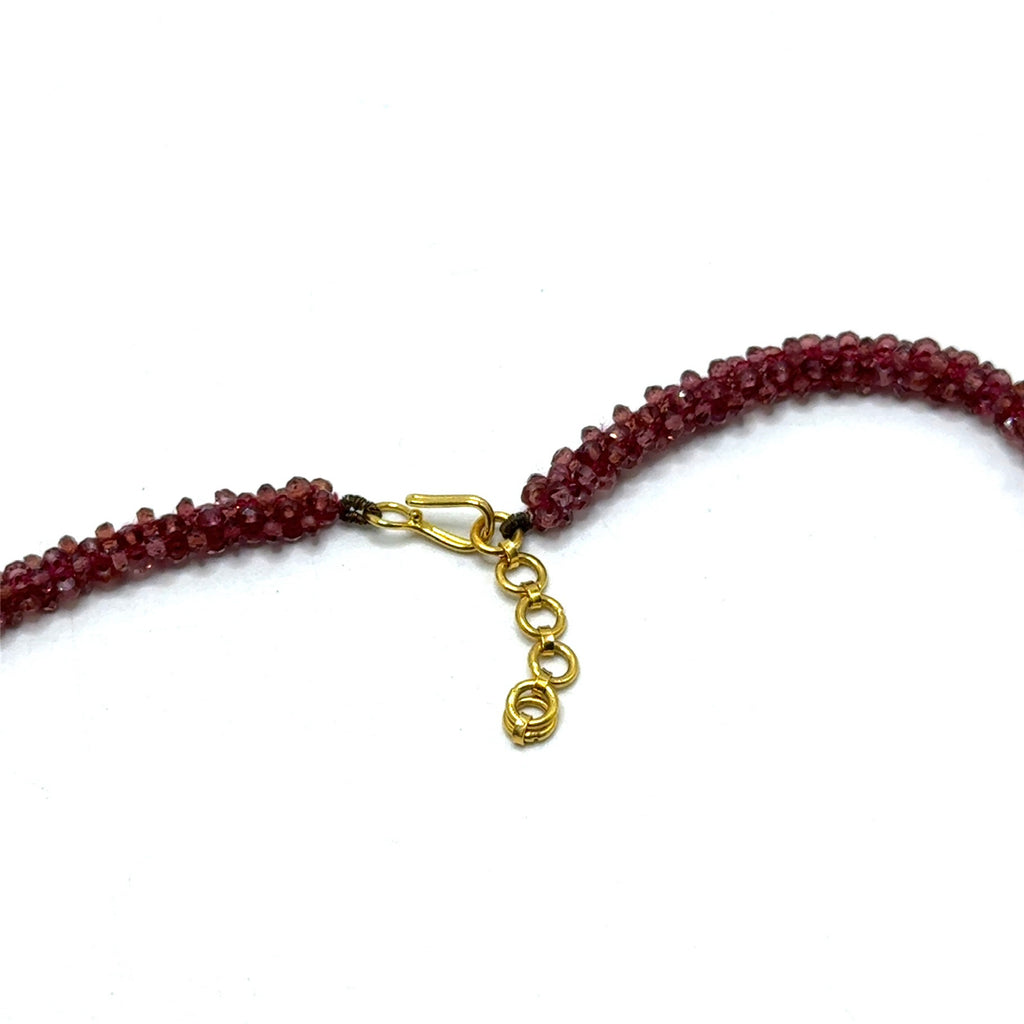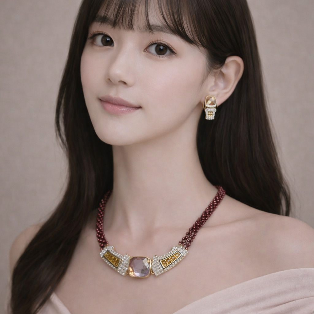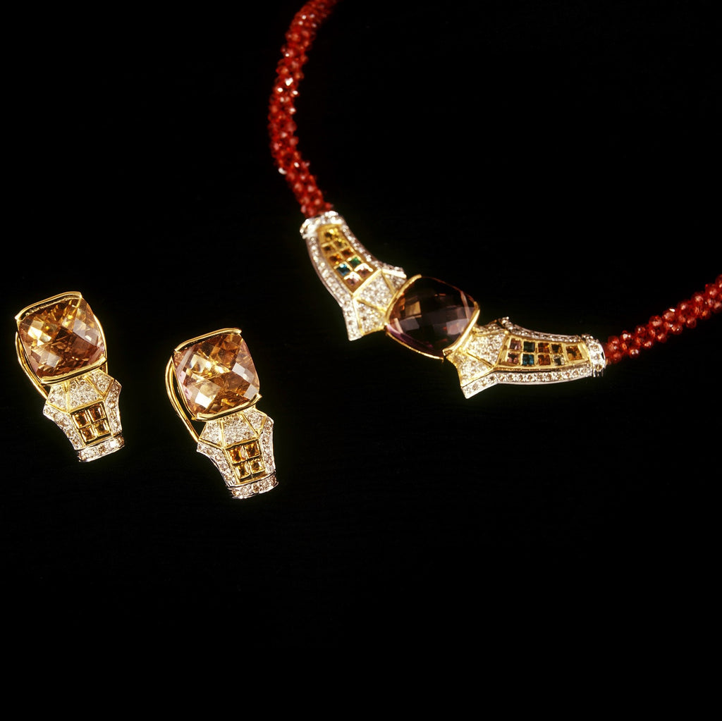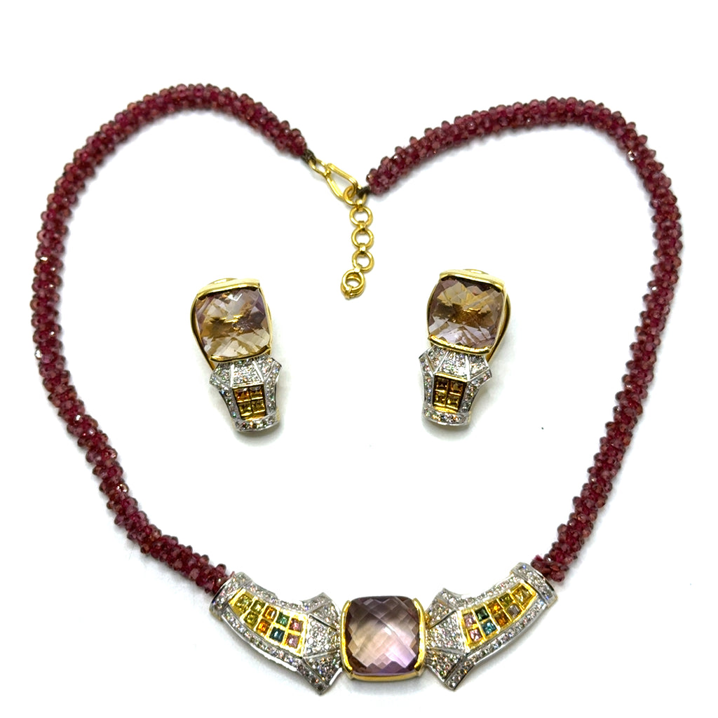 This striking designer set features a rich strand of natural garnet beads leading to a structured geometric centerpiece accented with vibrant multi-color sapphires and shimmering pavé-set diamonds. At the heart of the design, a luminous ametrine gemstone creates a captivating focal point with its warm dual-tone brilliance.