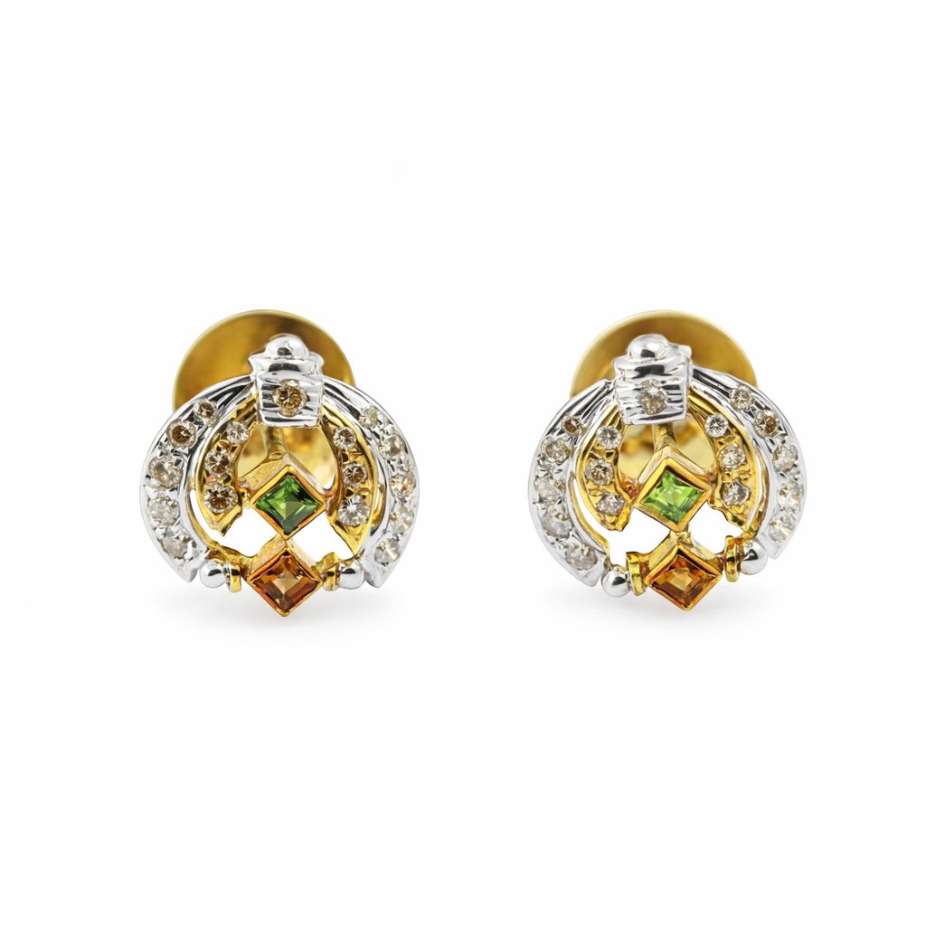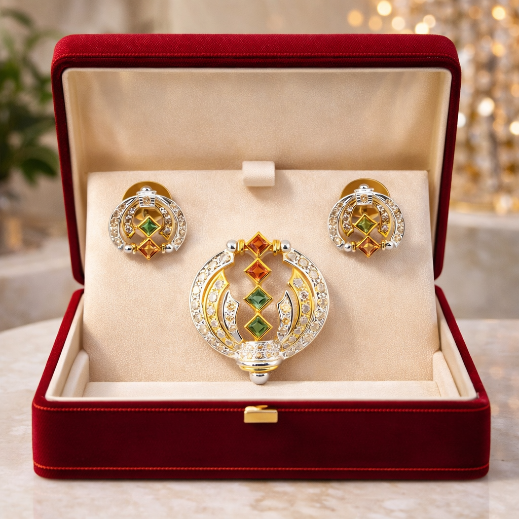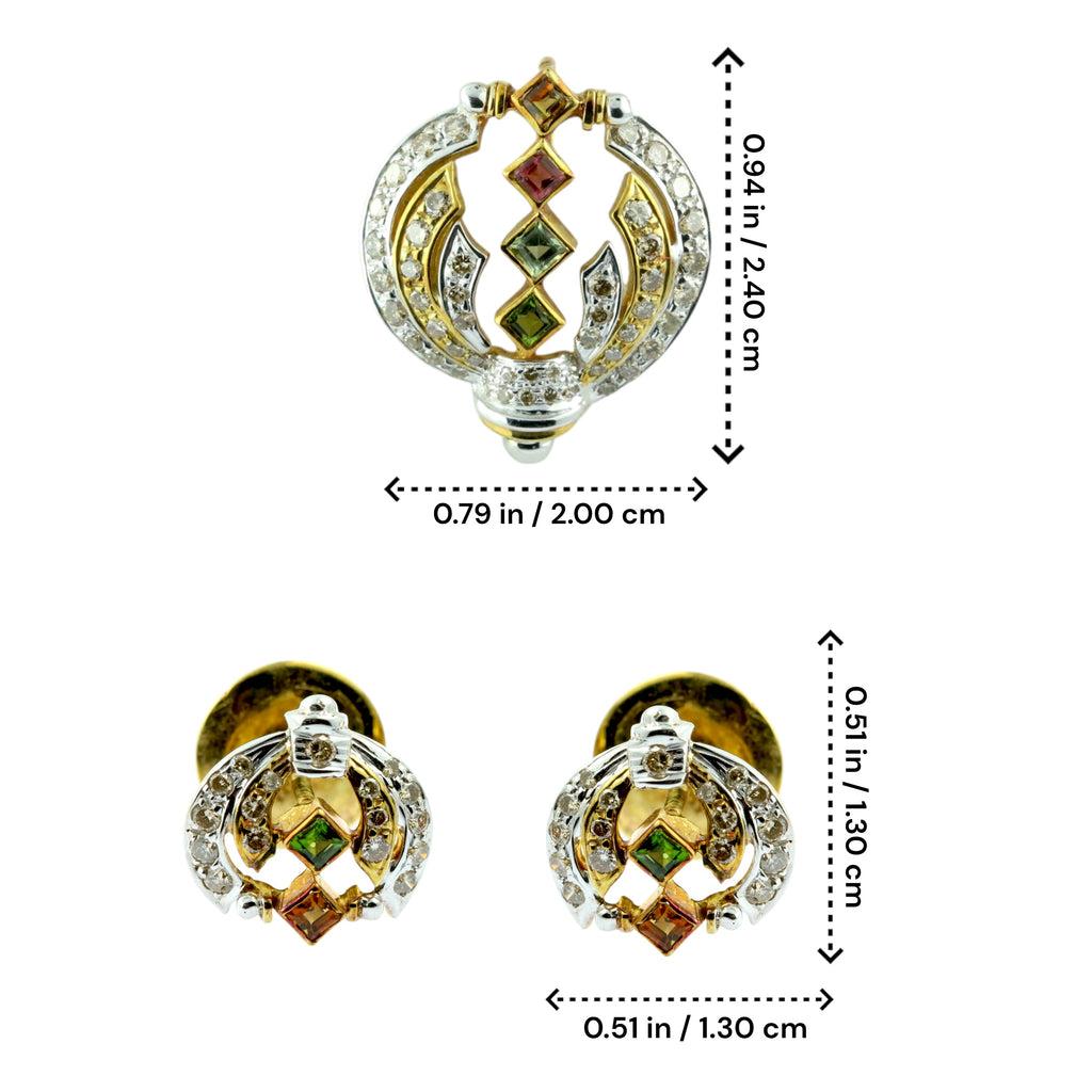 Celebrate vibrant elegance with this exquisite 18K yellow gold natural Diamond & Multi Tourmaline pendant and earrings set, designed to combine modern geometry with luxurious brilliance.