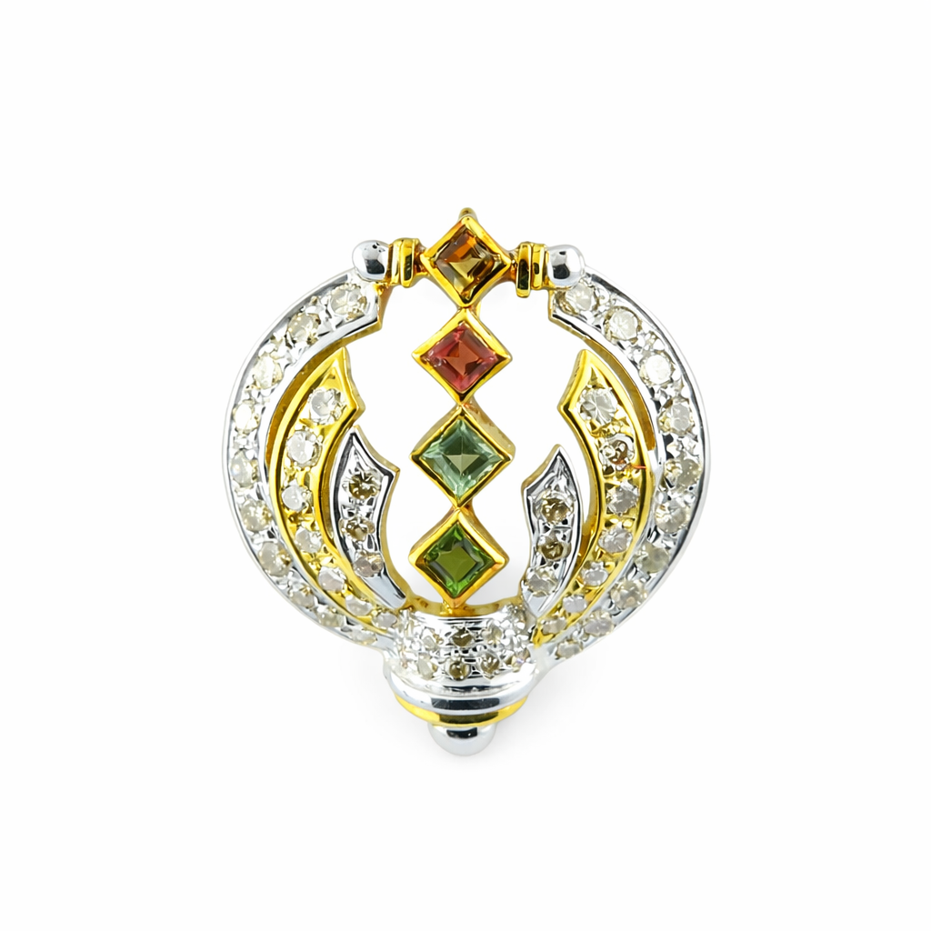 Crafted in solid 18K yellow gold with white gold accents, the two-tone detailing enhances the brilliance of the diamonds while highlighting the vibrant gemstones. The matching diamond and multi tourmaline earrings mirror the pendant’s refined design, creating a sophisticated and balanced ensemble.