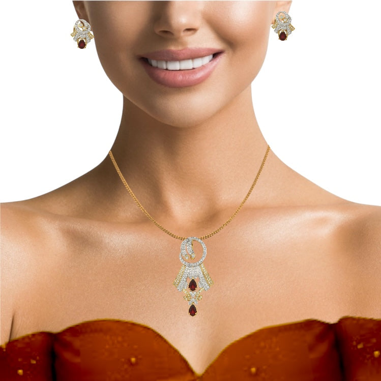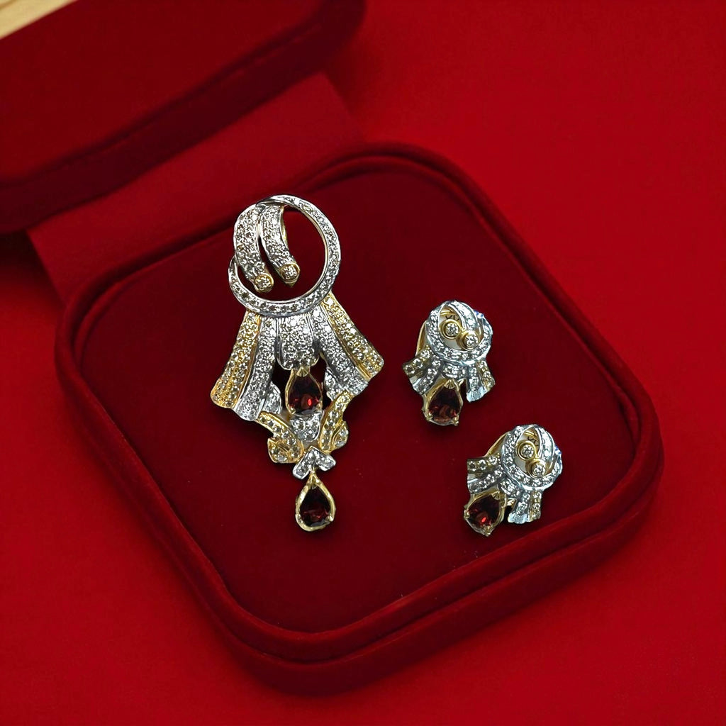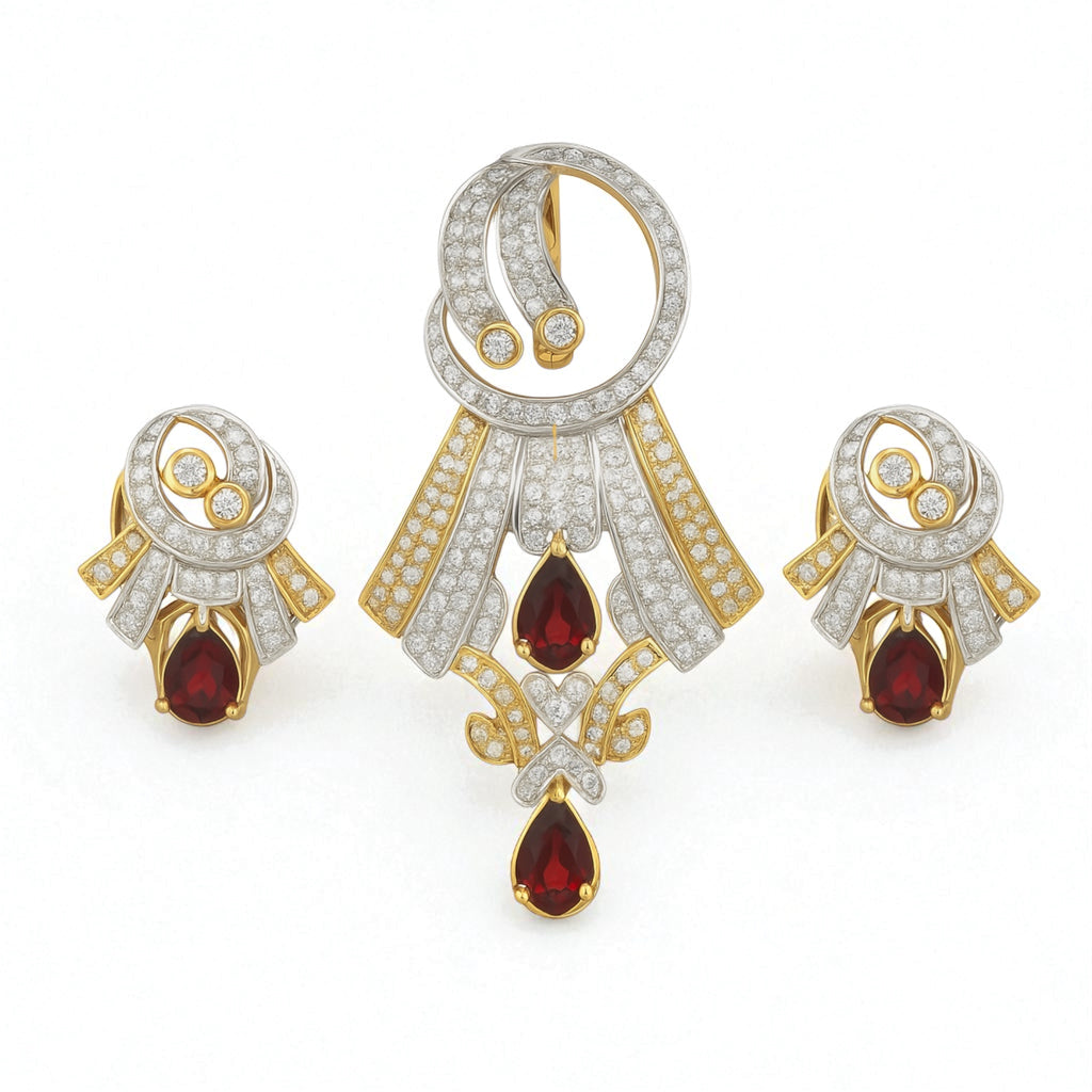 18K Yellow Gold Pendant Earring with Natural Diamond & Garnet Jewellery Set