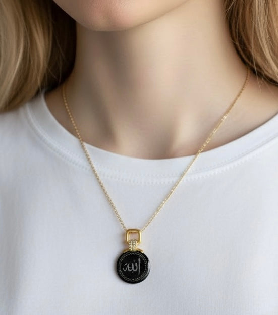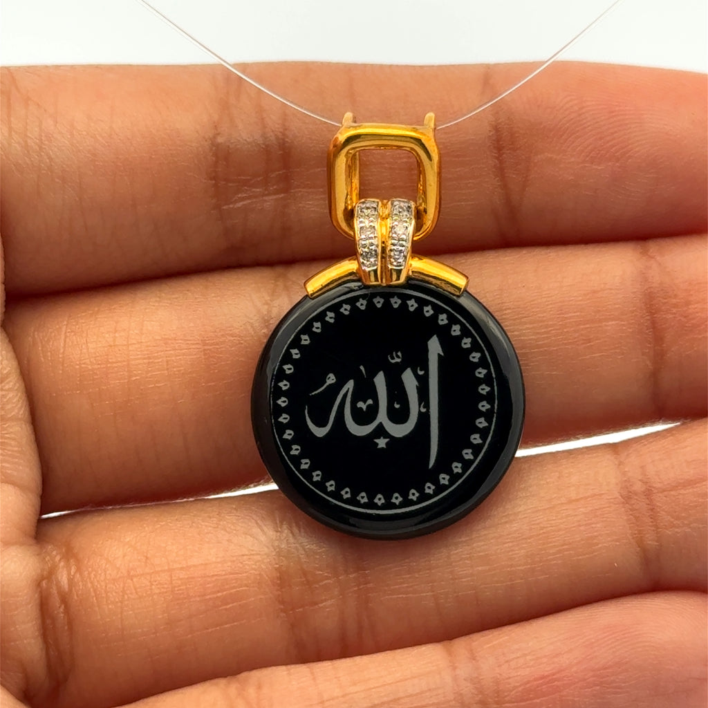 This meaningful piece features a polished Black Onyx disc engraved with the revered Allah (الله) script, symbolizing guidance and spiritual strength. The refined bail is accented with sparkling Natural Diamonds, adding subtle brilliance to the timeless religious design.