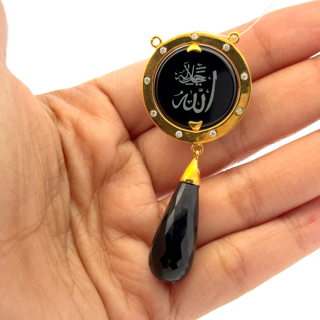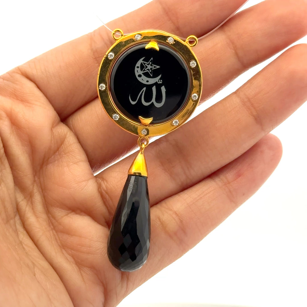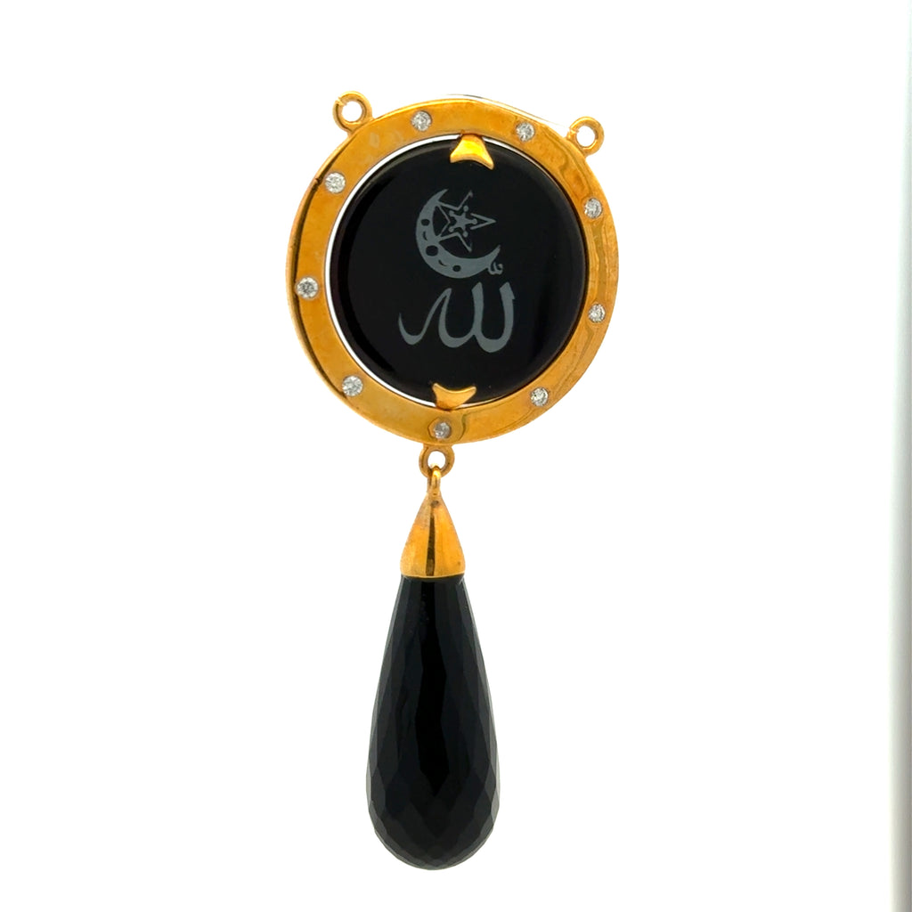 This meaningful piece features a polished Green Onyx disc engraved with sacred Allah (الله) Arabic calligraphy, framed by a circular halo accented with sparkling Natural Diamonds. A graceful Green Onyx teardrop dangle adds movement and refined contrast.
