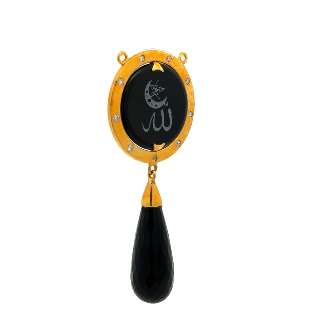 9K Yellow Gold Natural Diamond & Green Onyx Allah Two-Sided Drop Pendant | Islamic Religious Statement Jewelry