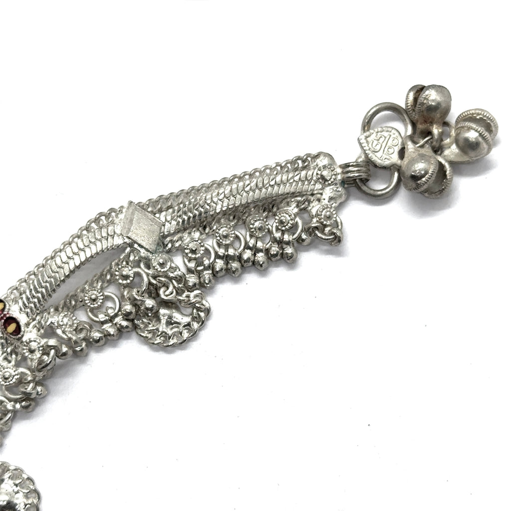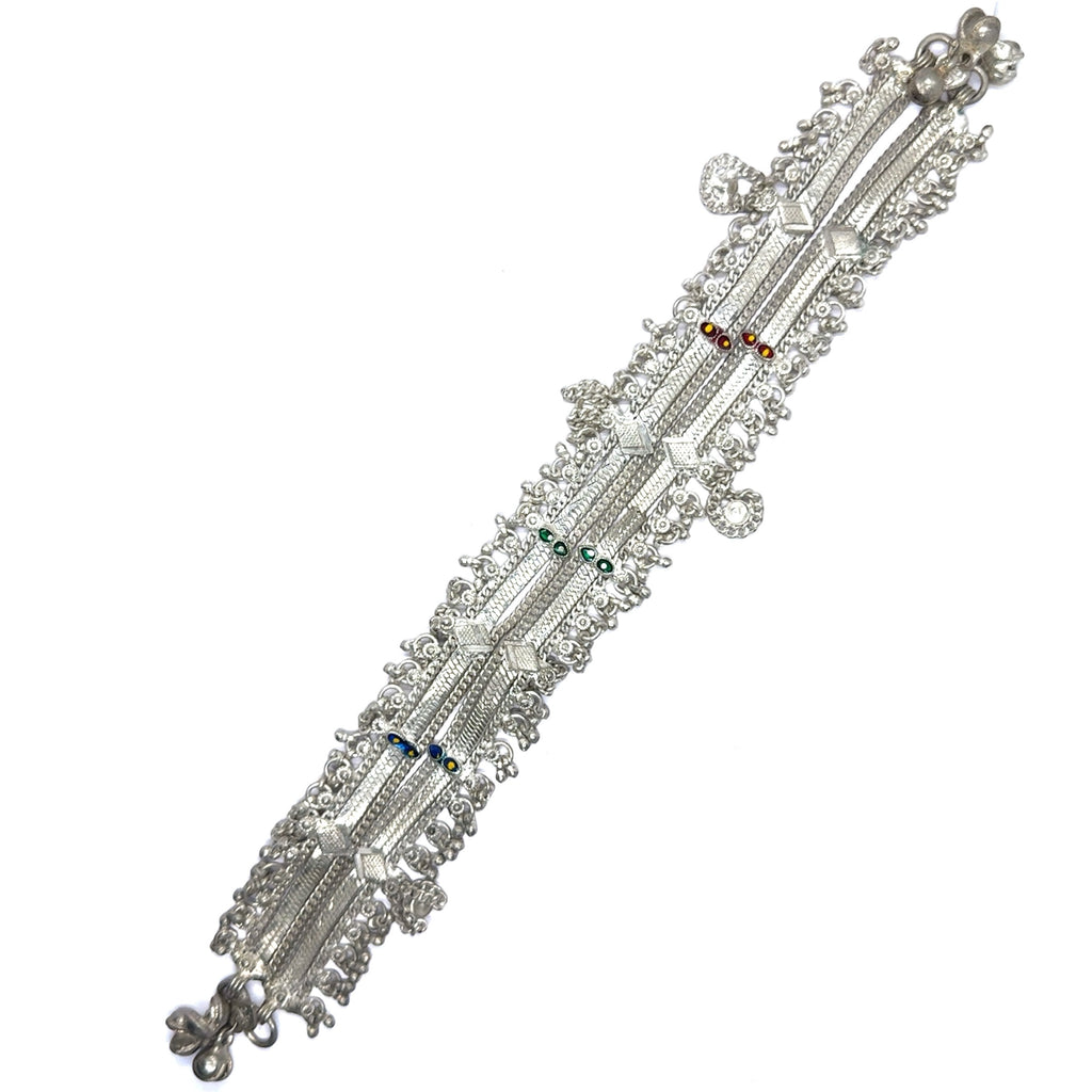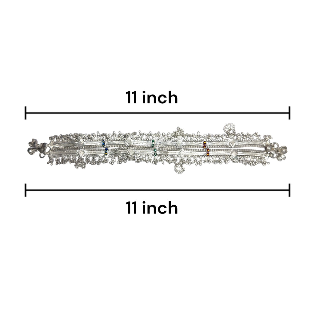 Celebrate expressive style with this captivating pair of German silver anklets. Each anklet is constructed from solid, linked panels, richly detailed with intricate engraved motifs and accented with pops of colorful beadwork. A delicate fringe of tiny sound bells adds a gentle, musical chime to your every step, enhancing their bohemian charm. The deeply oxidized finish gives this pair a stunning, vintage tribal-inspired look. A bold and artful accessory, these anklets are perfect for adding a touch of rustic flair to any ensemble.