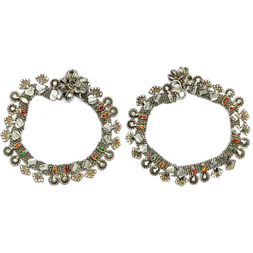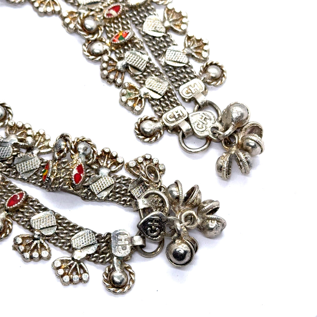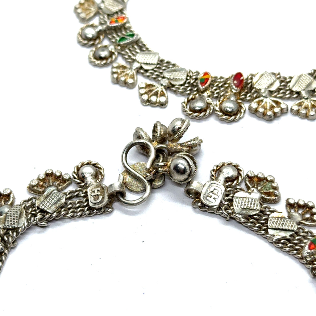 Celebrate elegant artistry with this exquisite pair of German silver anklets. Each anklet is beautifully constructed from linked panels, featuring intricate traditional motifs and subtle pops of colorful beadwork that showcase fine craftsmanship. A delicate fringe of charms adds a soft, musical sound to your movements, enhancing their graceful appeal. The artful, oxidized finish gives this pair a timeless, antique quality. Blending bohemian style with traditional elegance, these anklets are a captivating accessory perfect for any special occasion.