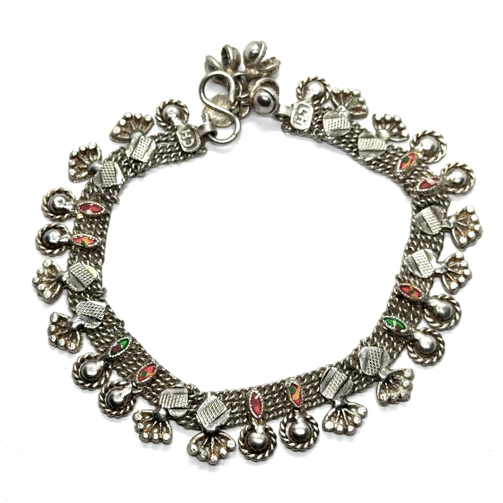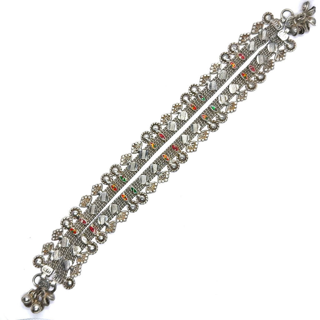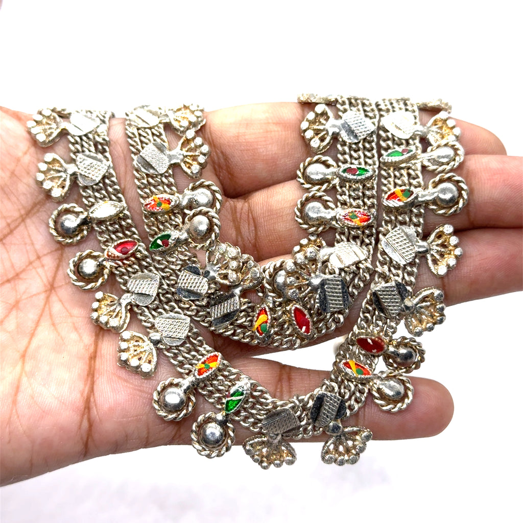 Celebrate elegant artistry with this exquisite pair of German silver anklets. Each anklet is beautifully constructed from linked panels, featuring intricate traditional motifs and subtle pops of colorful beadwork that showcase fine craftsmanship. A delicate fringe of charms adds a soft, musical sound to your movements, enhancing their graceful appeal. The artful, oxidized finish gives this pair a timeless, antique quality. Blending bohemian style with traditional elegance, these anklets are a captivating accessory perfect for any special occasion.