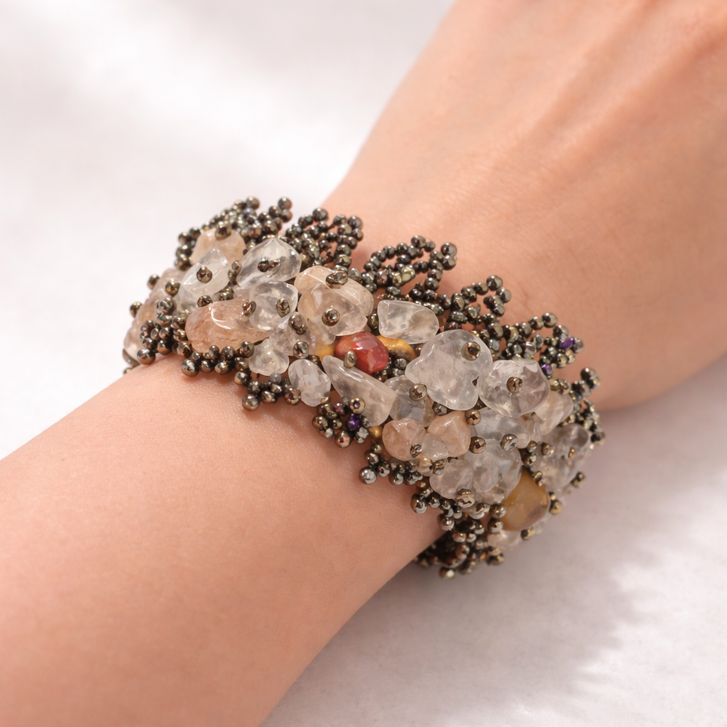 Celebrate gentle romance and natural healing energy with this beautiful handcrafted rose quartz beaded stretch bracelet. Featuring irregularly shaped chunky rose quartz nuggets in soft pink hues, intertwined with lustrous stone and accented by warm brown seed beads, this multi-strand cluster design creates a lush, organic texture that's both feminine and bohemian. The comfortable stretch fit makes it easy to wear and layer, perfect for everyday styling or special moments. Made with genuine rose quartz-known as the stone of love-this bracelet adds a touch of heartfelt elegance and positive vibes to any outfit, making it an ideal thoughtful handmade gift.