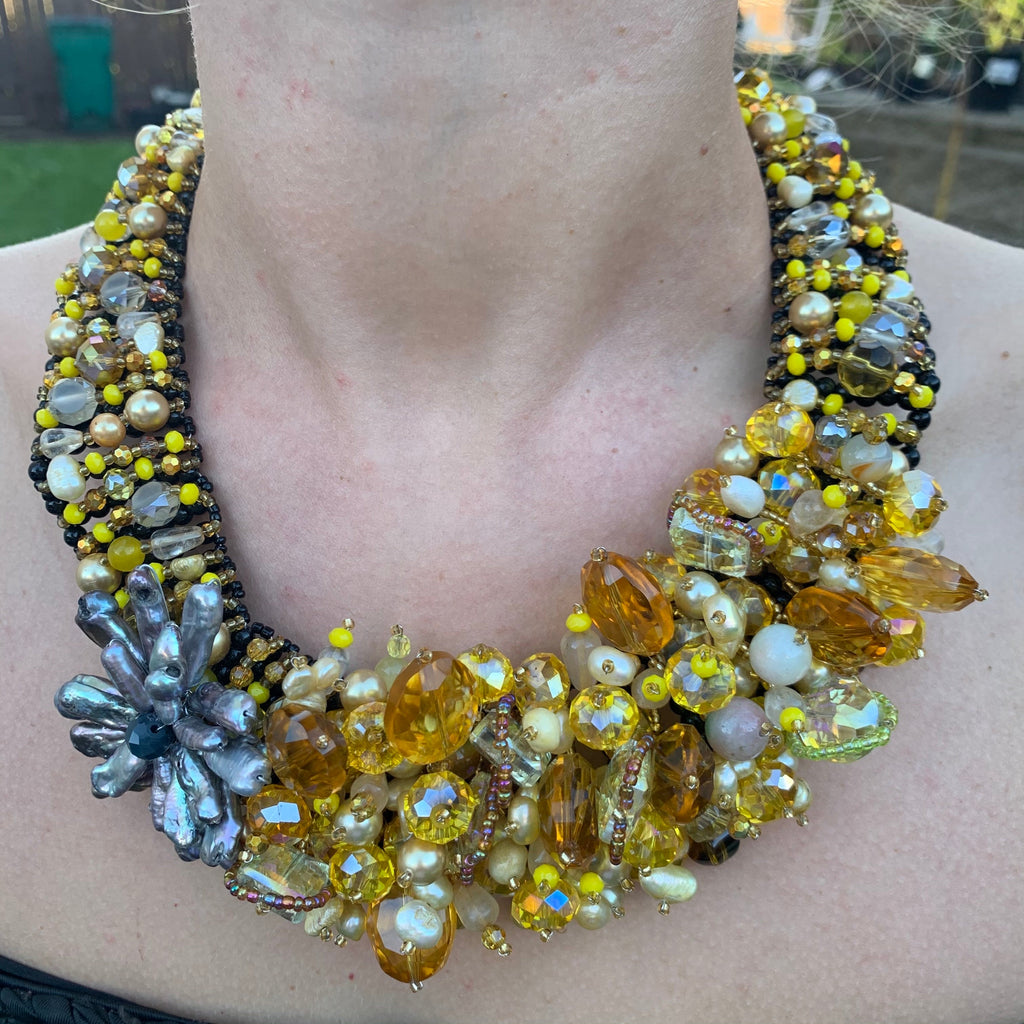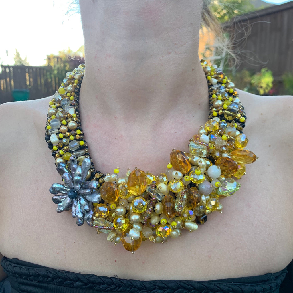 Handmade Bib Choker Bright 20" Summer Yellow Beads Pearl Semi Cluster Necklace