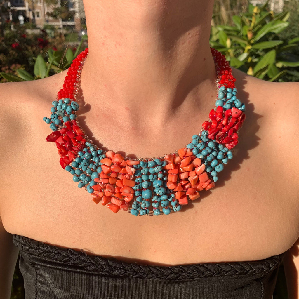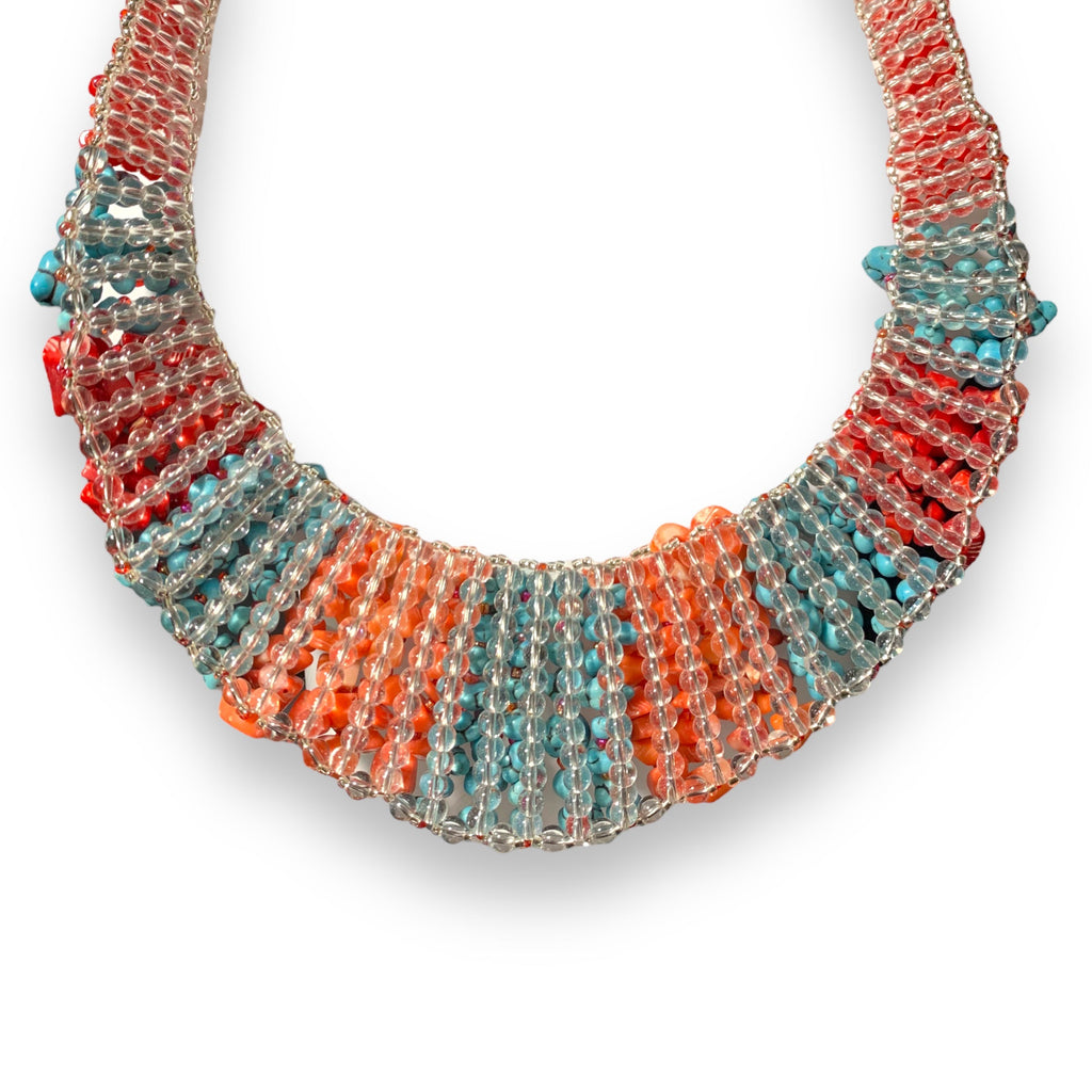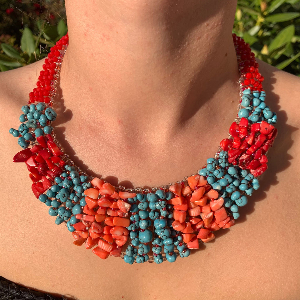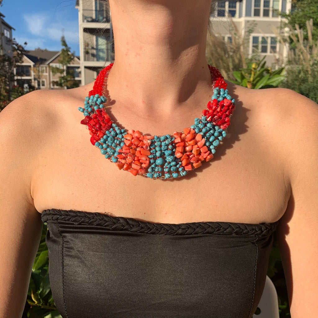Handmade Bib Choker Ombre Blue Turquoise & Coral 20" Unique Necklace
