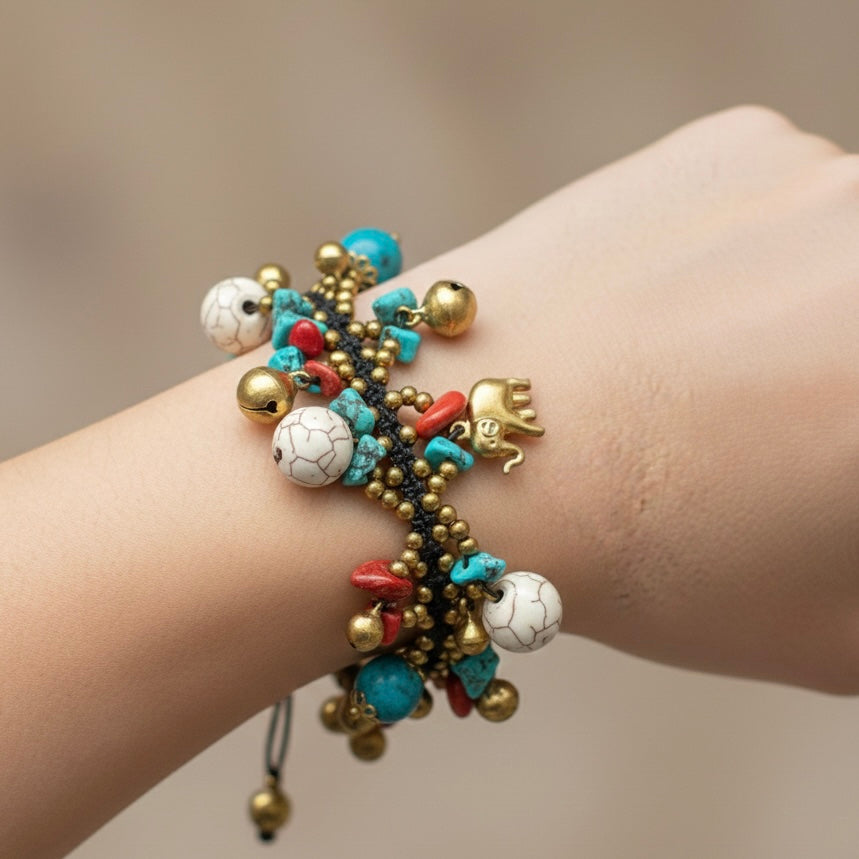 Celebrate joy, protection, and vibrant energy with this exuberant handcrafted multi-gemstone charm bracelet. A lively mix of turquoise chips, crisp white howlite nuggets, and bold red coral-colored beads is clustered together with golden seed beads, adorned with multiple golden elephant charms symbolizing wisdom and good fortune, plus an abundance of tiny bells that create a cheerful, magical jingle with every movement. The adjustable black cord with sliding knot closure ensures a comfortable, customizable fit for most wrist sizes, perfect for everyday wear or layering with other favorites. Packed with natural gemstones known for their calming, protective, and energizing properties, this boho bracelet brings positivity, luck, and a burst of colorful whimsy to any outfit-ideal as a unique and thoughtful handmade gift.