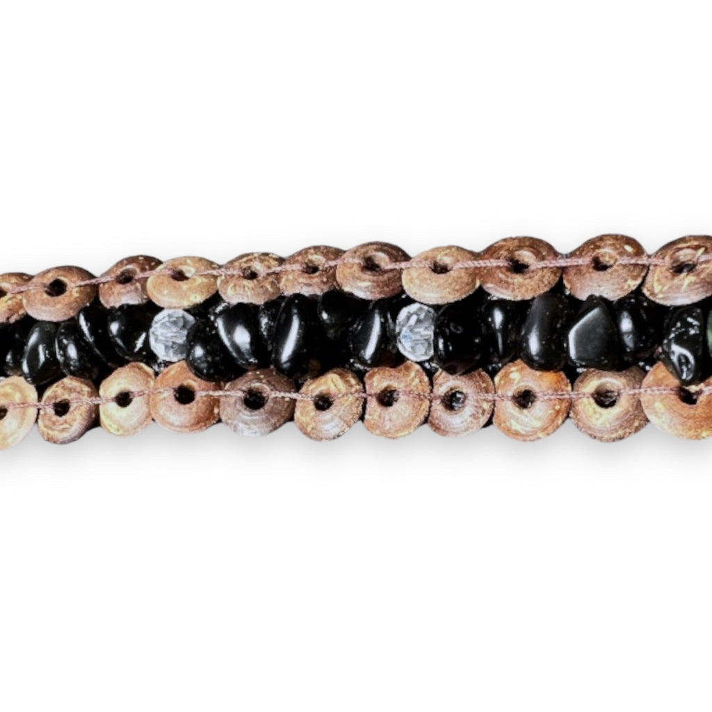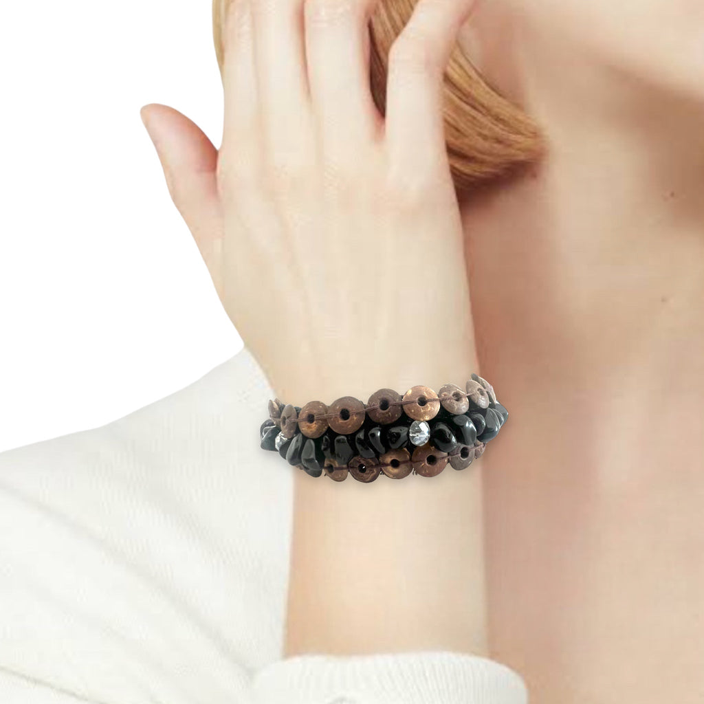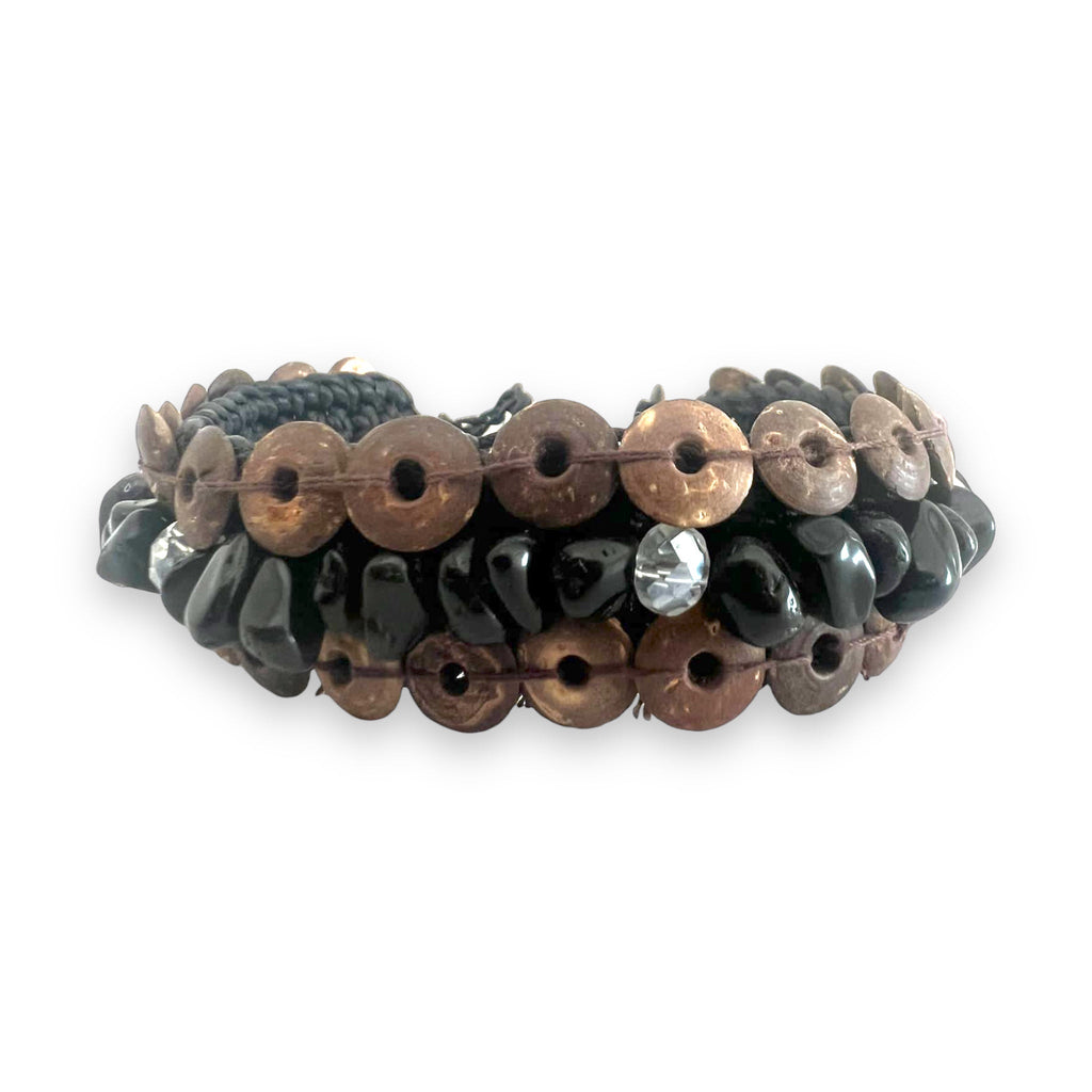 Handmade Brown Coconut Shell Beads Black Onyx Bracelet 7 Inch Artisan Design Wristband
