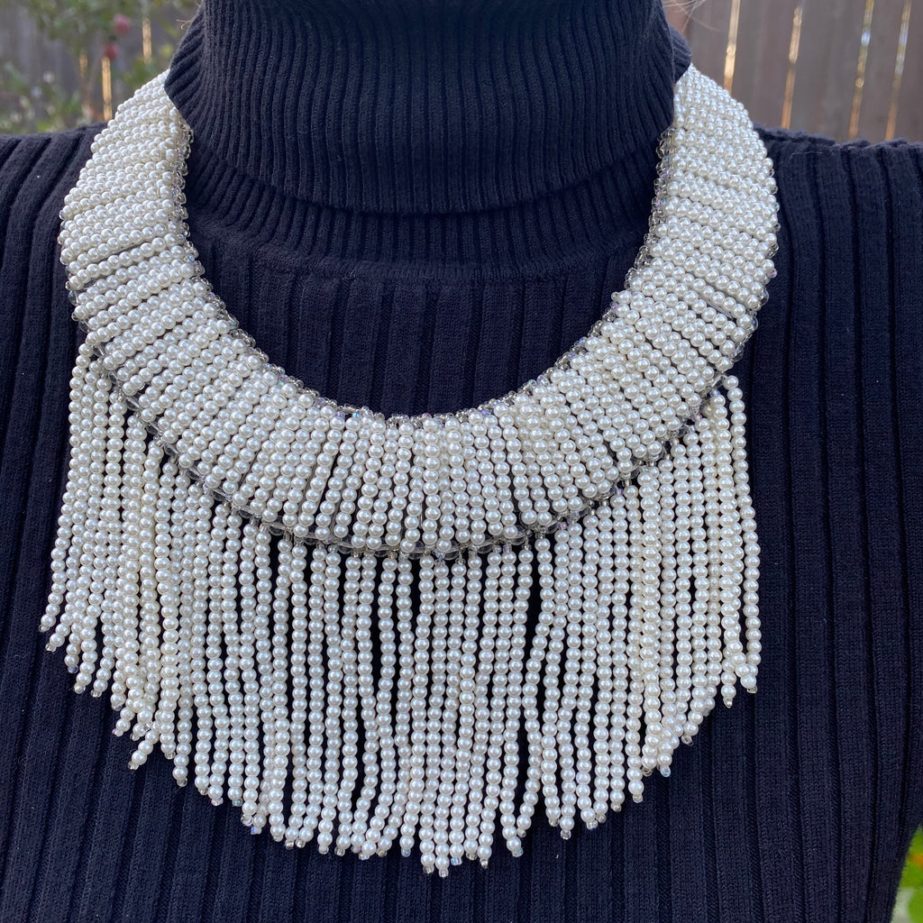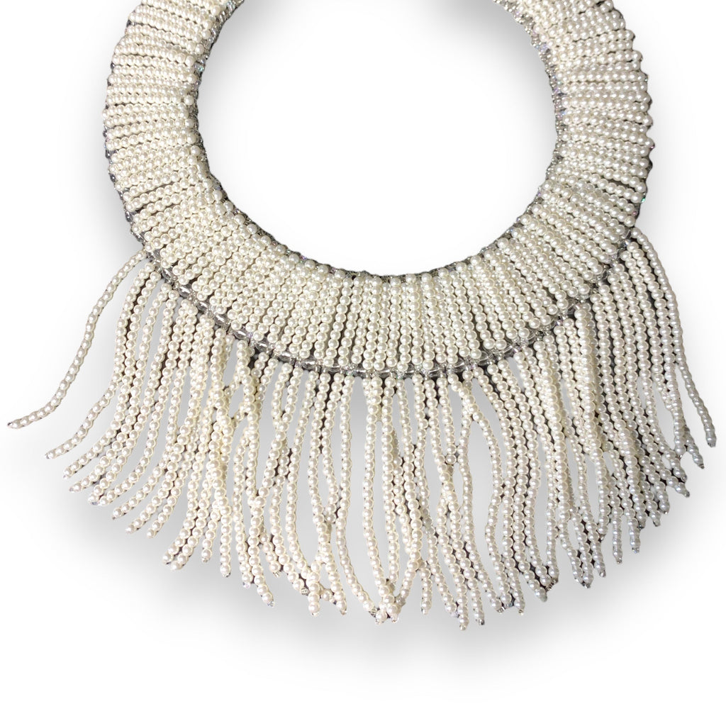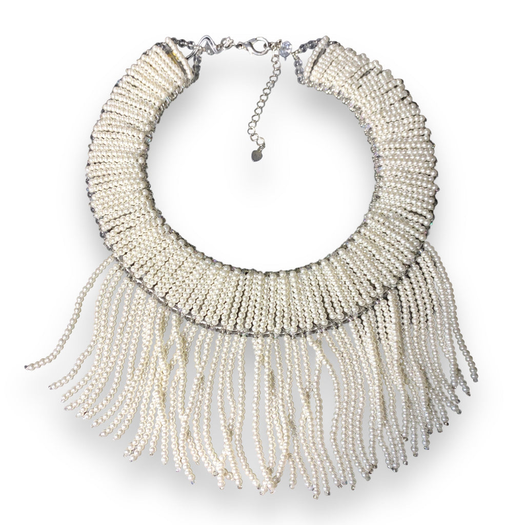 Handmade Choker Fringed Tassels White Pearl 19" Chic Bib Necklace