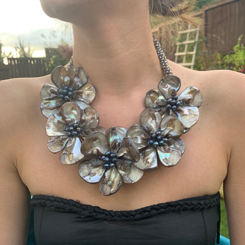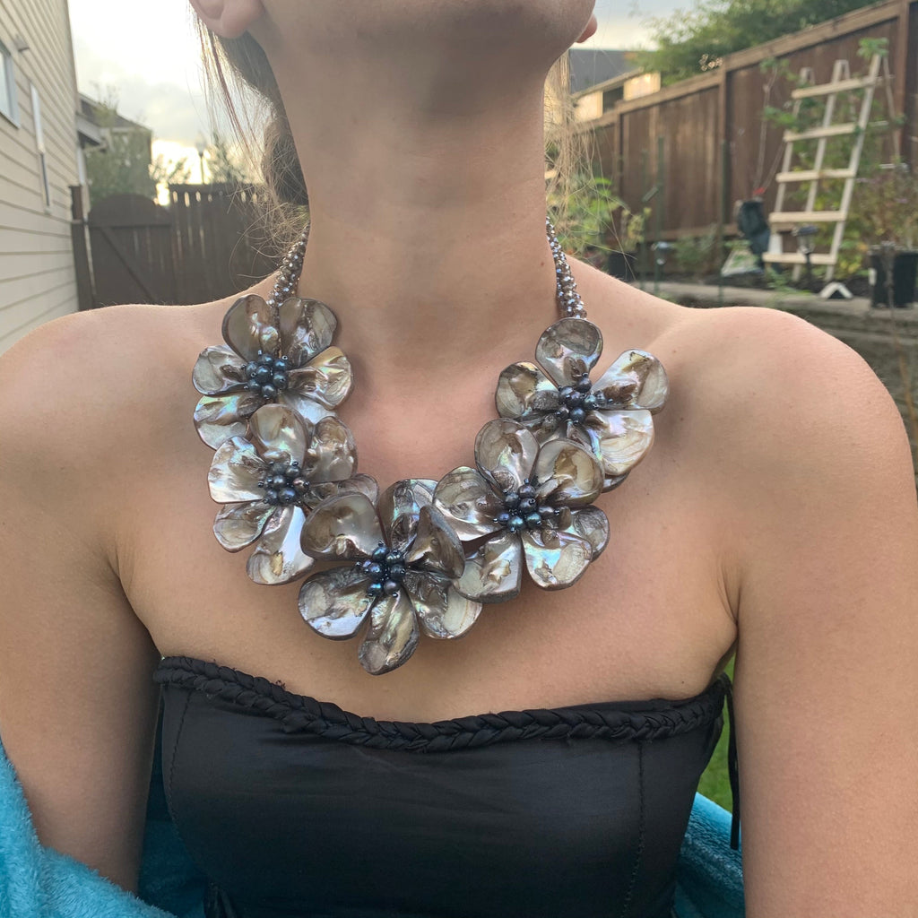 Handmade Mother of Pearl Necklace 20" Shells and Pearl Floral Choker