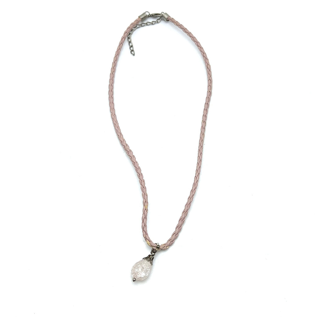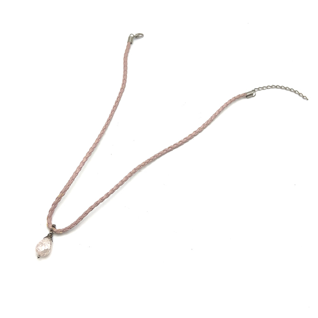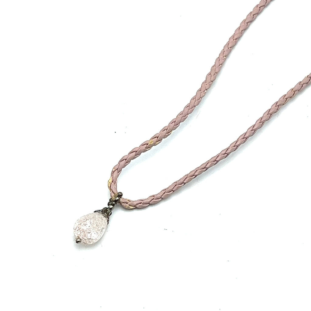 White Glass Drop Stone 16mm with Light Pink Twisted Cord Pendant Necklace