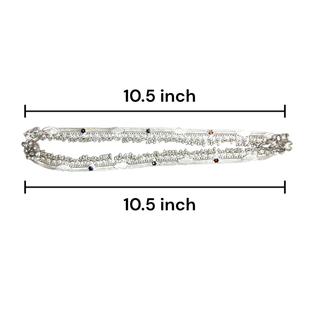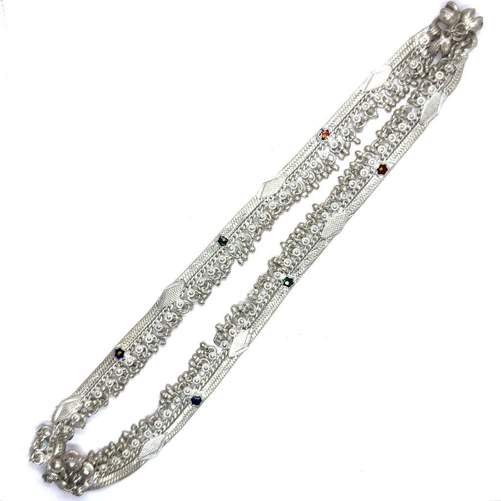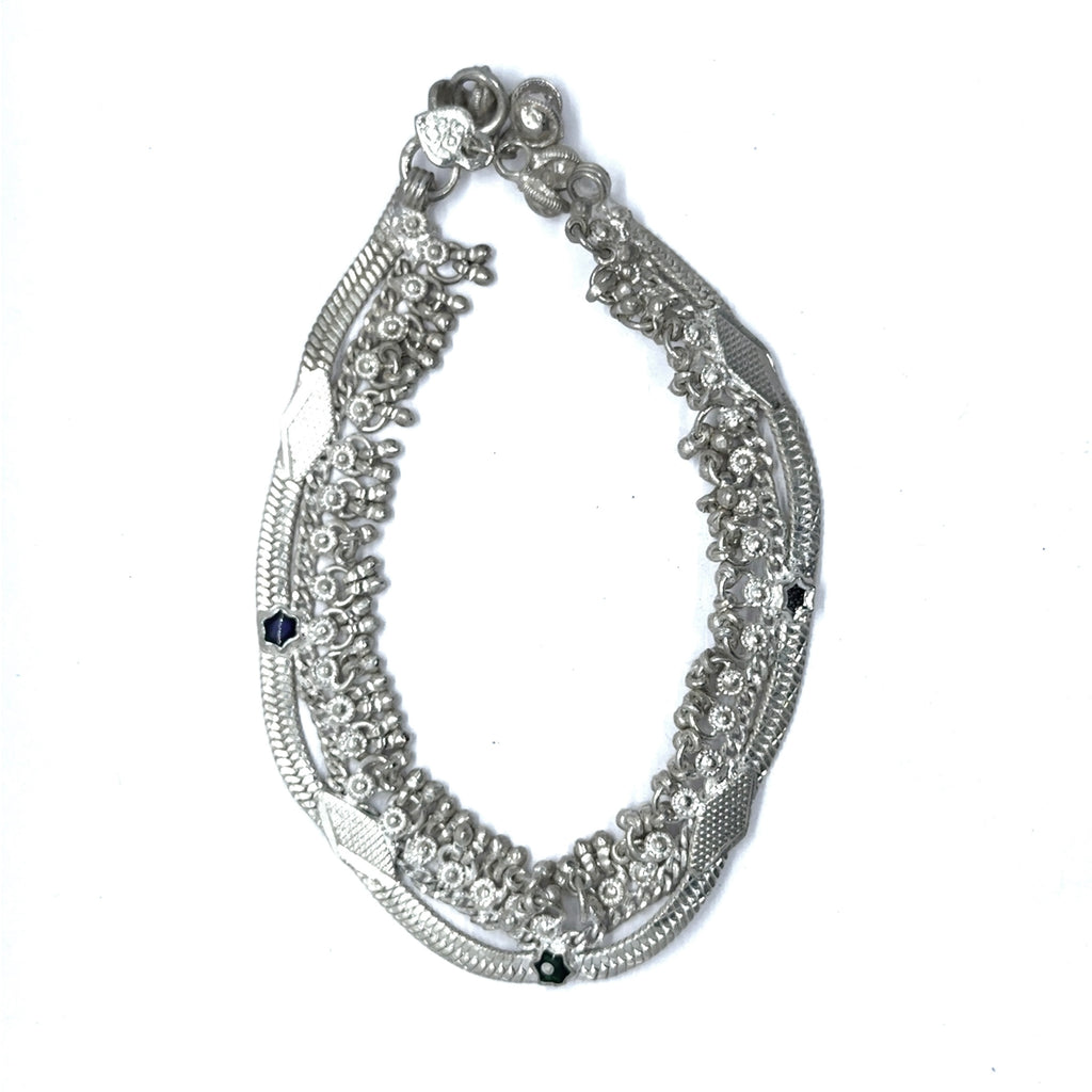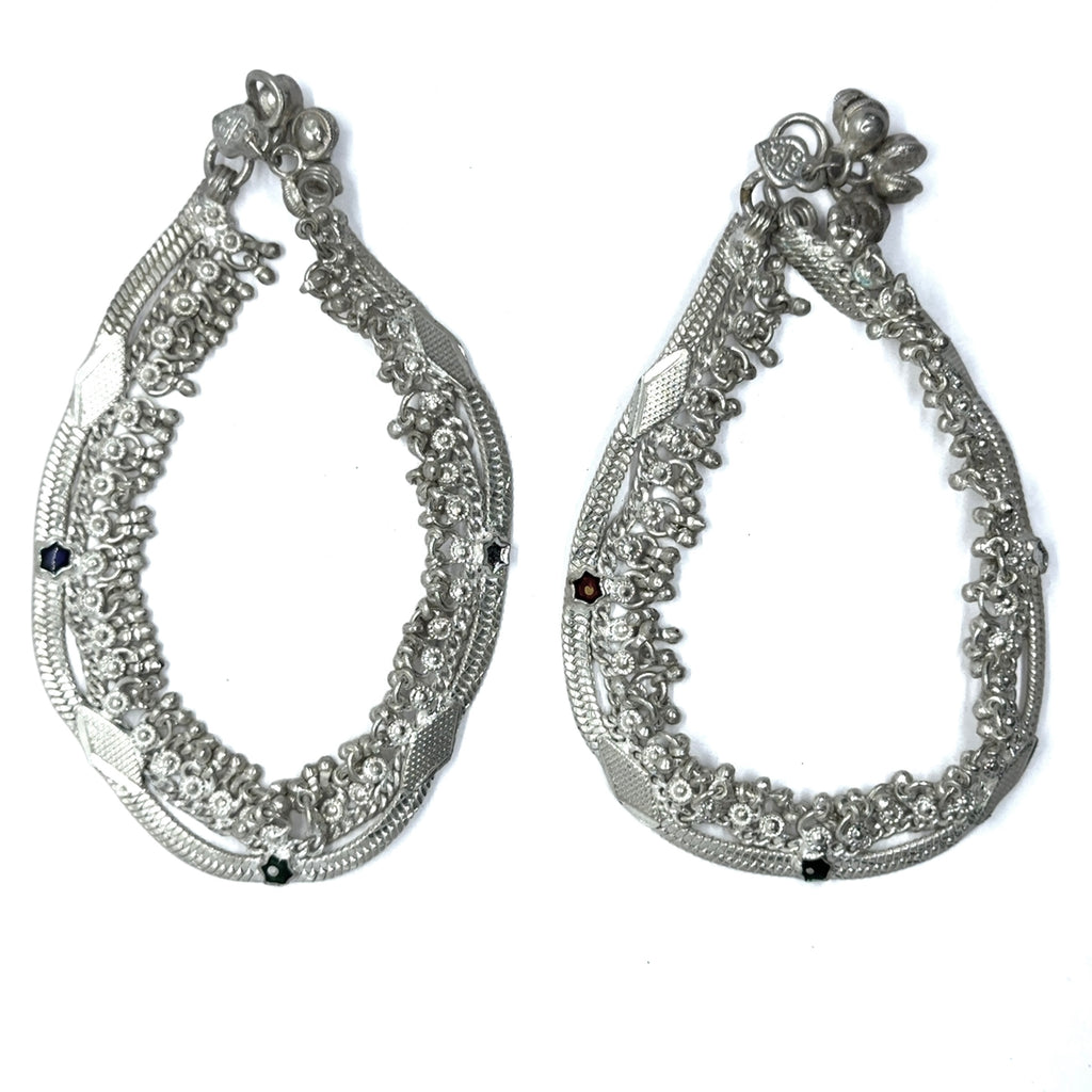 Celebrate rich ethnic heritage with this stunning pair of German silver anklets. These anklets are defined by their substantial, multi-layered construction, featuring intricate traditional motifs that speak to authentic craftsmanship. A delicate fringe of tinkling charms adds a gentle, melodic sound to every step, enhancing their rustic charm. The deeply oxidized finish gives this pair a dramatic, heirloom-quality appearance. Perfect for making a bold, earthy statement, these anklets are a striking and culturally rich accessory for any enthusiast of tribal-inspired jewelry.