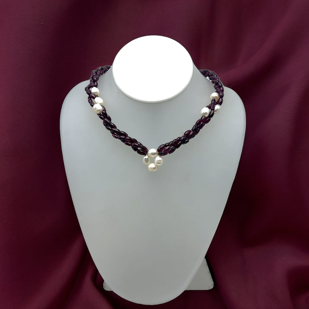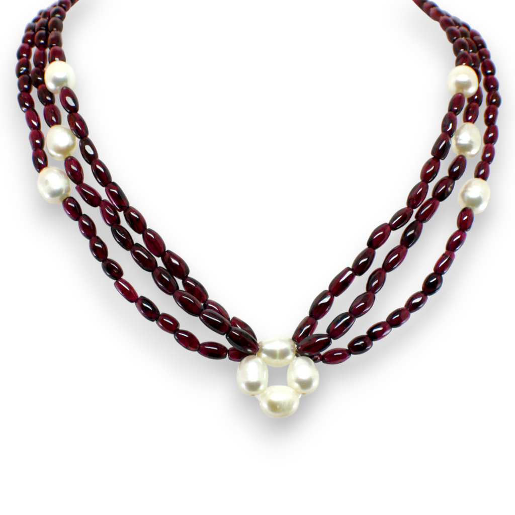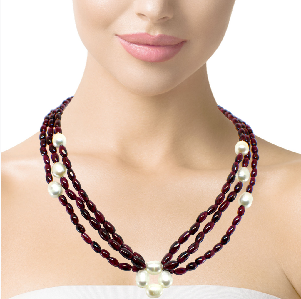 Natural Garnet Balloon & Plain Pearl Three Strand Gemstone Necklace