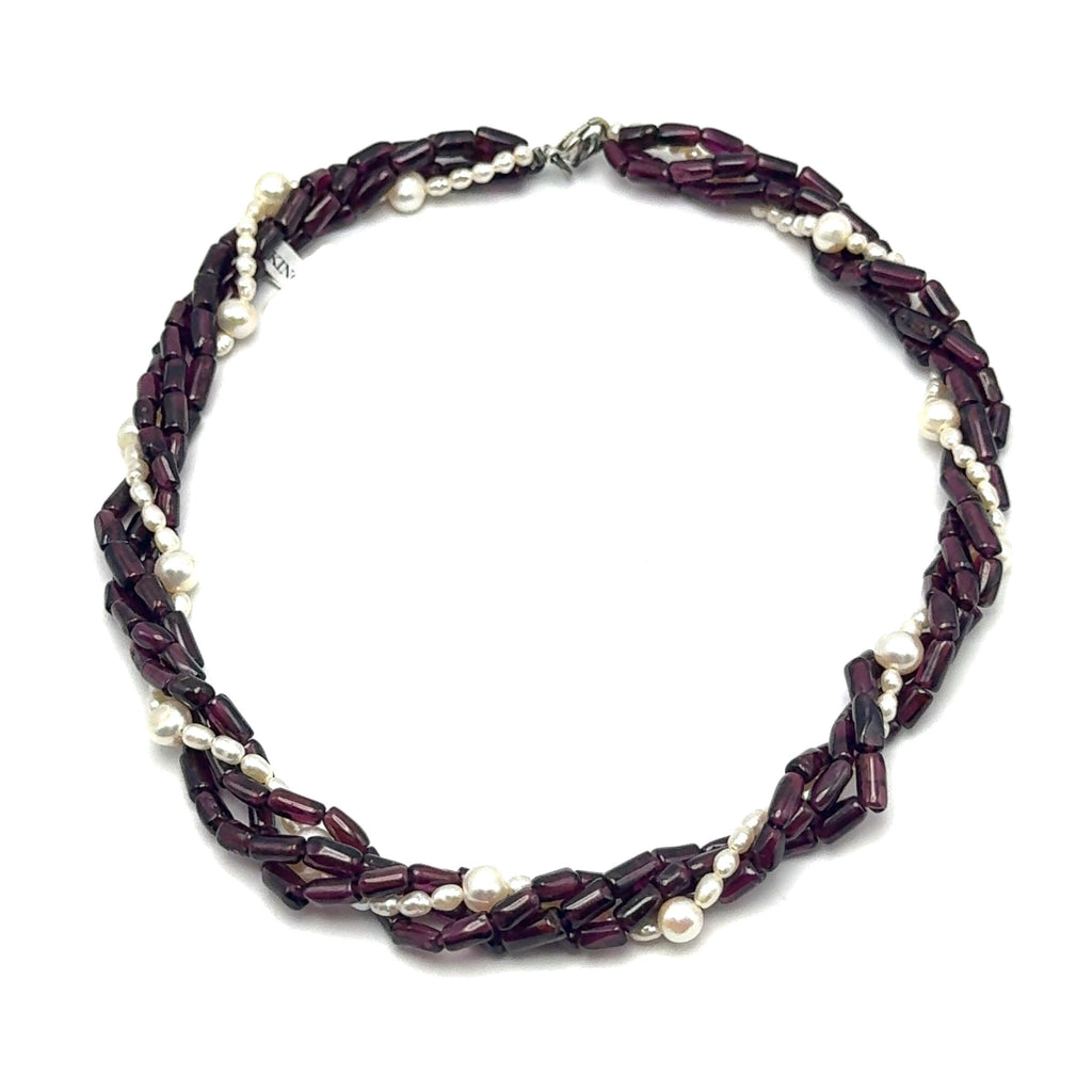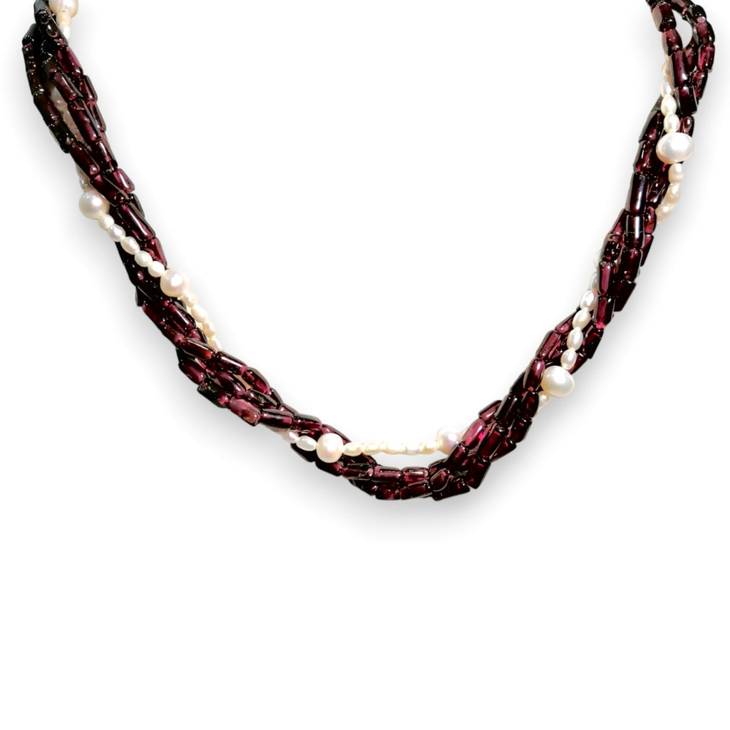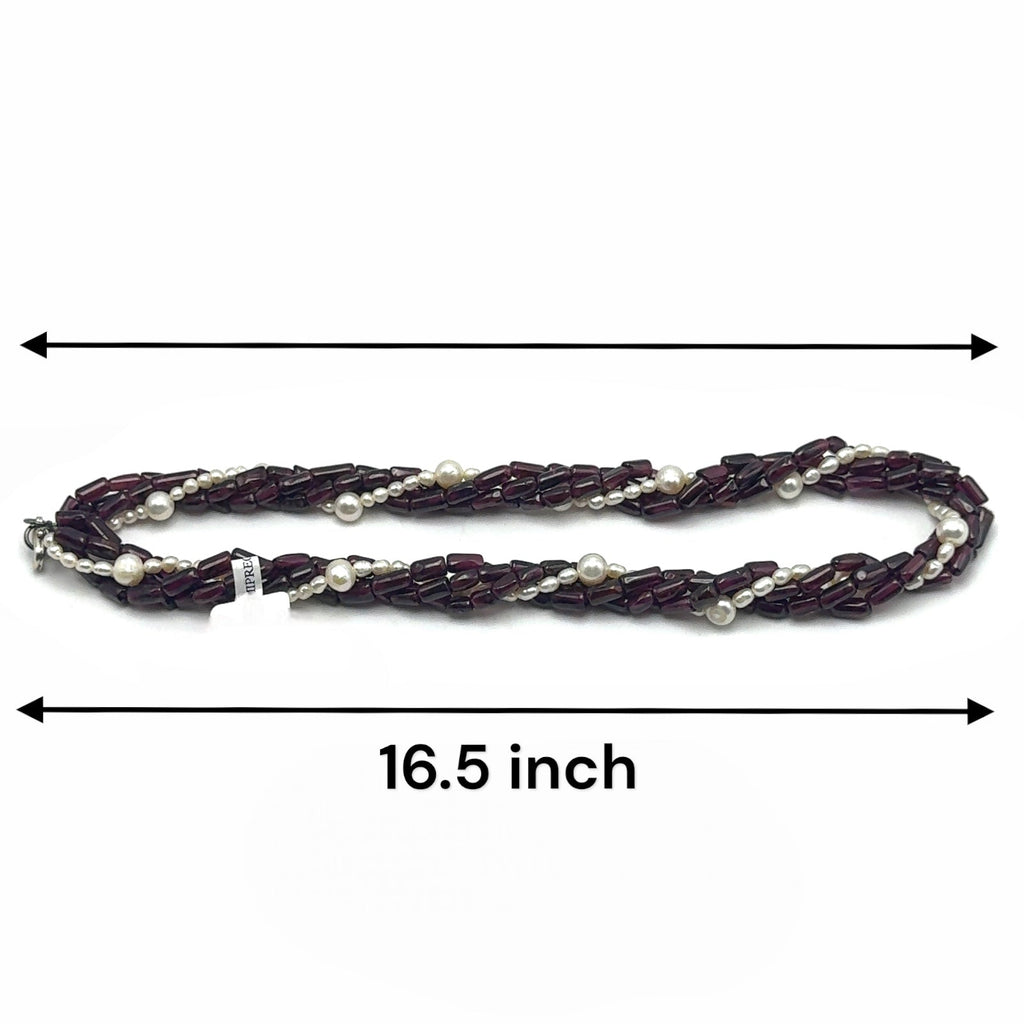 Natural Garnet Tube & Plain Pearl Twisted Gemstone Necklace