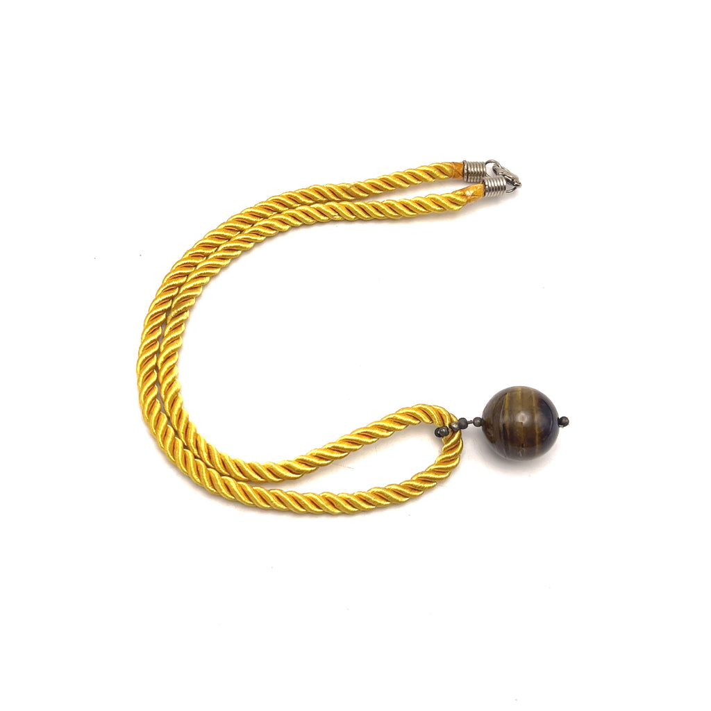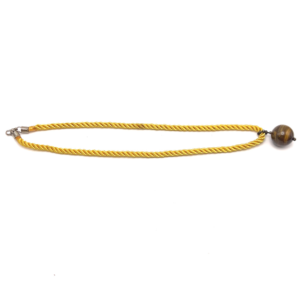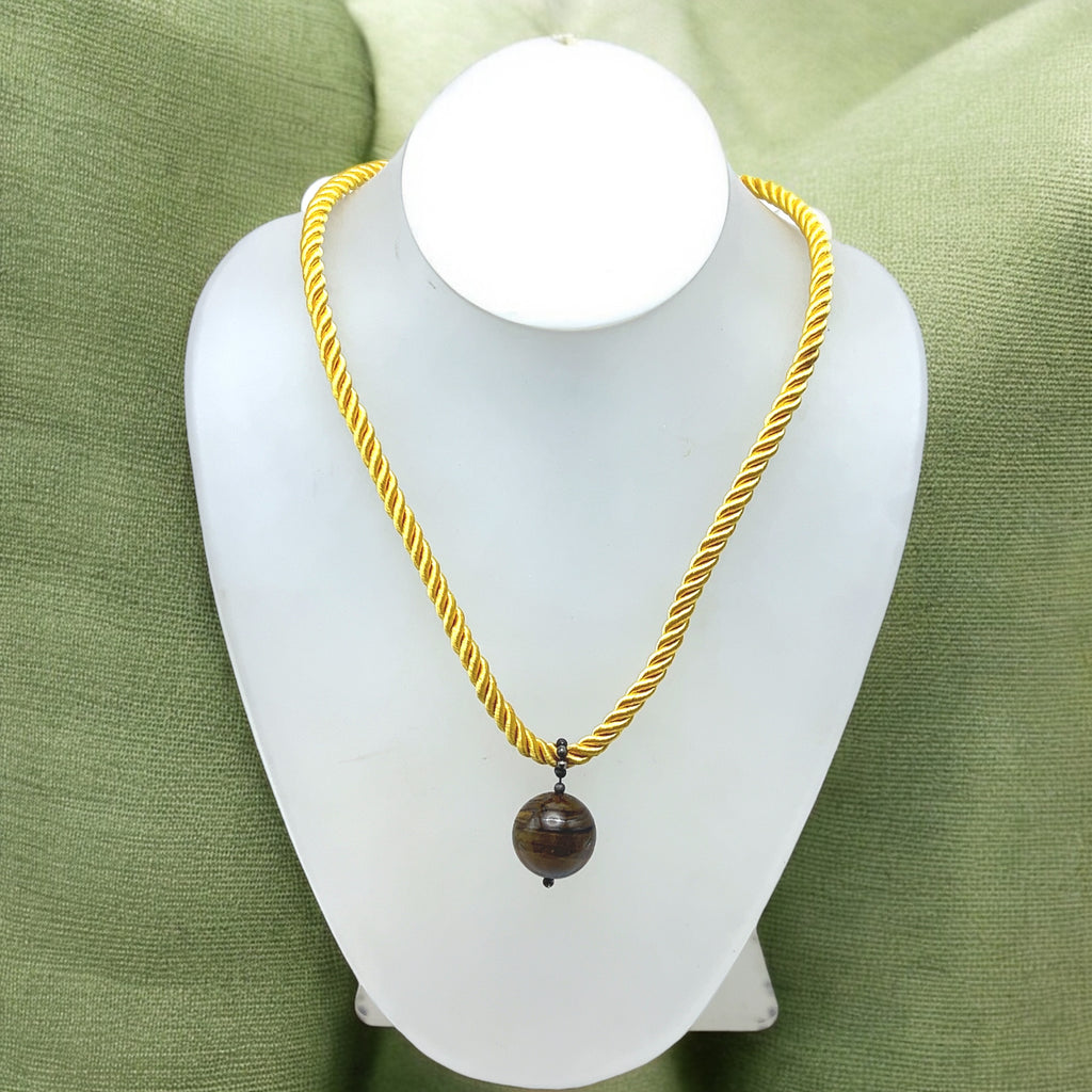 Natural Tiger's Eye Gemstone 18mm Ball with Yellow Twisted Cord Pendant Necklace